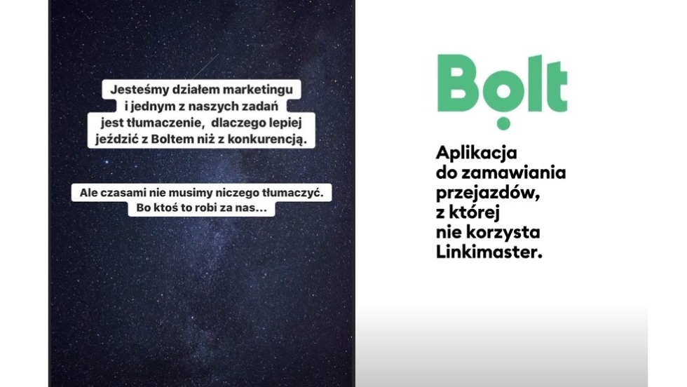 Patoinfluencerka Linkimaster opublikowała na swoim Instagramie relację, w której pochwaliła się, że korzysta z usług Ubera. Bolt postanowił więc wykorzystać to do promocji swoich usług i zareklamował się hasłem „Aplikacja do zamawiania przejazdów, z której nie korzysta Linkimaster”.