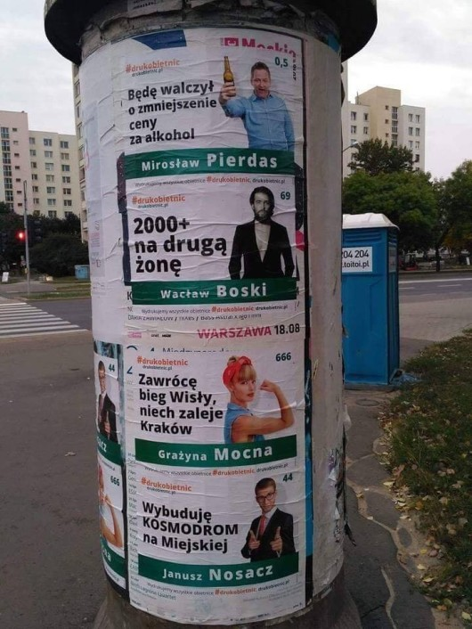 2000+ na drugą żonę, kosmodrom na Miejskiej, zmniejszenie ceny za alkohol – na słupach ogłoszeniowych w Warszawie pojawiły się plakaty wyborcze z obietnicami bez pokrycia składanymi przez Janusza Nosacza, Mirosława Pierdasa i Wacława Boskiego. Za pomocą takich ogłoszeń drukarnia ViperPrint pokazuje, że kwestia #drukuobietnic bez pokrycia dotyczy kandydatów ze wszystkich stron świata polityki i że w ramach swoich usług wydrukuje wszystkie obietnice.