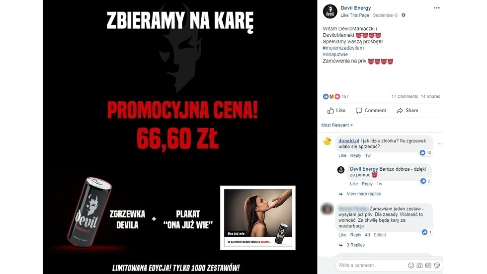 Producent napoju energetycznego Devil Energy Drink wyrokiem Sądu Okręgowego w Legnicy z sierpnia br. musi przeprosić za swoją kontrowersyjną reklamę oraz zapłacić 60 000 zł na rzecz fundacji „Dla Polonii”, zajmującej się polskimi uczniami ze Wschodu. W celu zebrania środków na pokrycie kary producent napoju, firma Waterius rozpoczęła sprzedaż plakatów, na których widnieje kontrowersyjna kreacja.