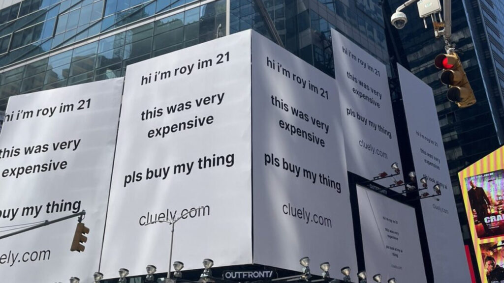 W sercu reklamowego chaosu, na Times Square, pojawiły się minimalistyczne billboardy startupu Cluely. To biały ekran z czarnym napisem: „hi i’m roy im 21 / this was very expensive / pls buy my thing”. Bez CGI i efektów specjalnych, a wciąż przyciąga wzrok.
