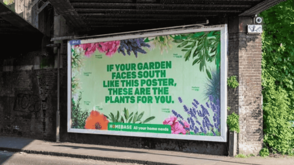Brytyjskie sklepy Homebase prowadzą kampanię OOH, wykorzystując kierunek padania światła słonecznego. W tym celu stworzono billboardy, na których umieszczono nazwy gatunków różnych kwiatów, w zależności od tego, w którą stronę świata skierowana jest reklama. „Jeśli twój ogród skierowany jest na północ, jak ten billboard, te kwiaty się w nim sprawdzą” – czytamy w przykładowym haśle.