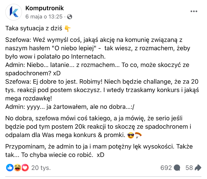 Sieć sklepów z elektroniką, Komputronik, zdecydowała się na przeprowadzenie nietypowej akcji socialowej. Na swoim profilu na Facebooku, 6 maja 2024 r., pojawił się post, pokazujący, że czasem lepiej nie żartować z szefową. W rezultacie może się okazać, że… trzeba będzie skoczyć ze spadochronem.