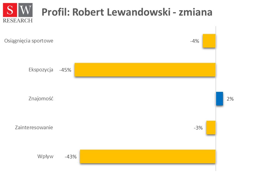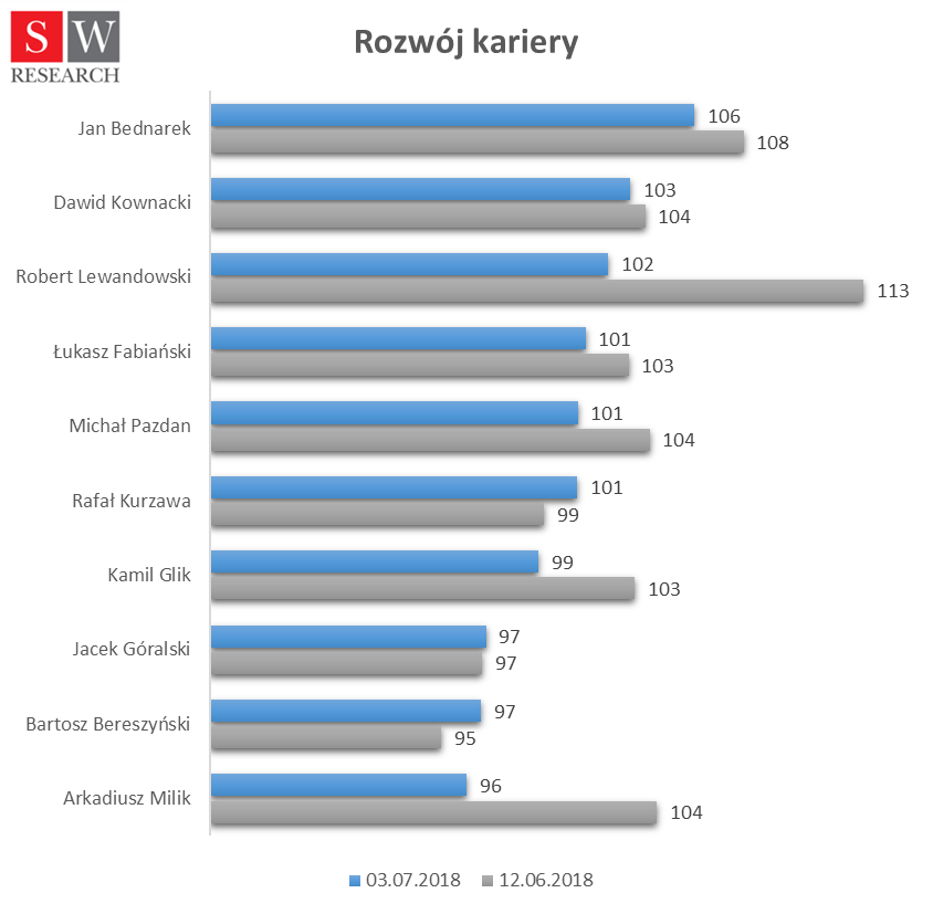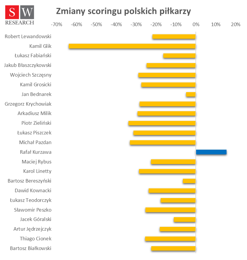 Liderem rankingu niezmiennie pozostaje Robert Lewandowski. Niemniej jednak słaby występ na mundialu spowodował, że spadek jego wartości marketingowej, choć jest mniejszy od średniej, to wynosi aż 22 proc. Jednak największym „marketingowym” przegranym, jak wynika z analiz SW Intelligence, jest Kamil Glik. Przed wyjazdem do Rosji był jednym z piłkarzy, których wartość marketingowa była oceniana najwyżej. Tymczasem po powrocie do Polski spadła aż o 64 proc. Natomiast zawodnikami, którzy odnotowali najniższe spadki są Jan Bednarek (5 proc.) i Bartosz Bereszyński (7 proc.).