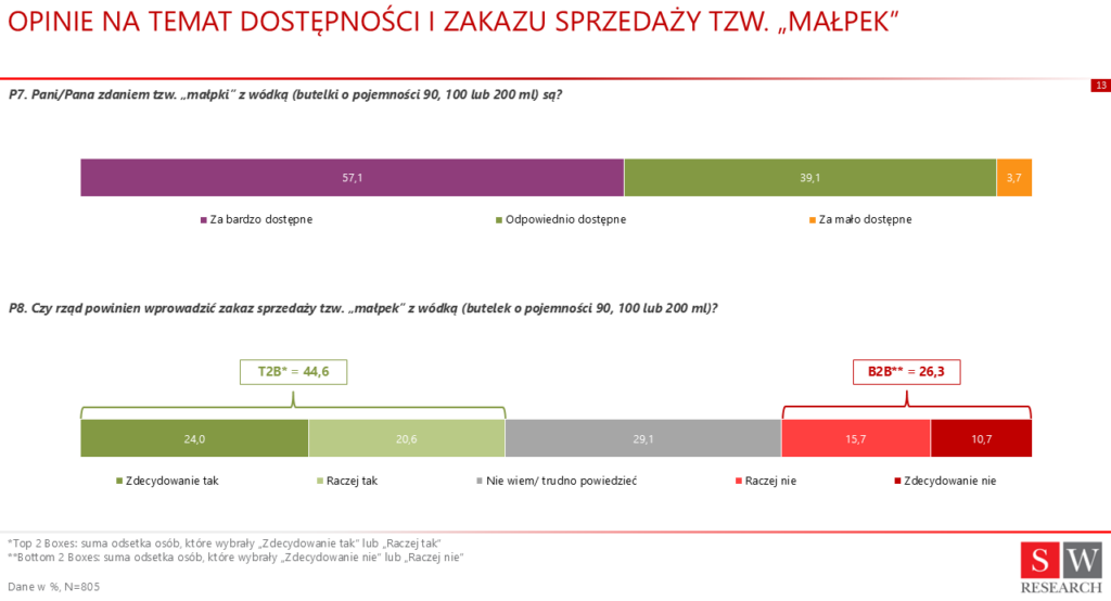 57,1% uczestników grudniowego badania przeprowadzonego przez SW Research przyznała, że „małpki” z wódką są zbyt łatwo dostępne, a jedynie dla 4% z nich jest przeciwnego zdania. Dla 10% respondentów ceny „małpek” są bardzo wysokie, a niemal połowa pytanych (45%) sądzi, że całkowity zakaz sprzedaży „małpek” z wódką to krok we właściwą stronę. Co więcej, już 46% Polaków chciałoby podwyższenia podatków i opłat od alkoholu w opakowaniach o pojemności do 300 ml. Jednocześnie przeciwnego zdania jest zaledwie 28% badanych.