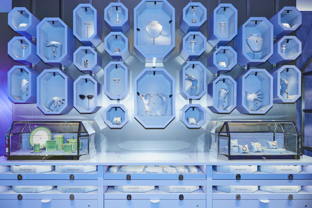 Swarovski kontynuuje ewolucję swojej marki i zmienia wizerunek kolejnego sklepu detalicznego. Tym razem transformacji uległ oddział w Westfield Mokotów. Projekt ma oddawać hołd mieniącemu się pięknu kryształu, jednocześnie odzwierciedlając urzekający urok Warszawy. Sklep jest utrzymany w niebieskim kolorze Swarovski, który reprezentuje siłę życiową wody – integralnego elementu w produkcji kryształów. Poza tym, poszczególne obszary sklepu utrzymane są w charakterystycznych dla marki odcieniach różu, błękitu, żółci i zieleni.