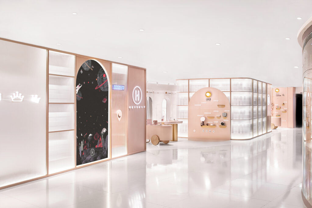 Luksusowe wnętrze wypełnia również piękna gra świateł, które odbija się od metalicznych wykończeń, szkła oraz chromowanych czy aksamitnych elementów całej przestrzeni handlowej. Na ścianach znajdują się także ośmiokątne półki, które również nawiązują do kryształów.