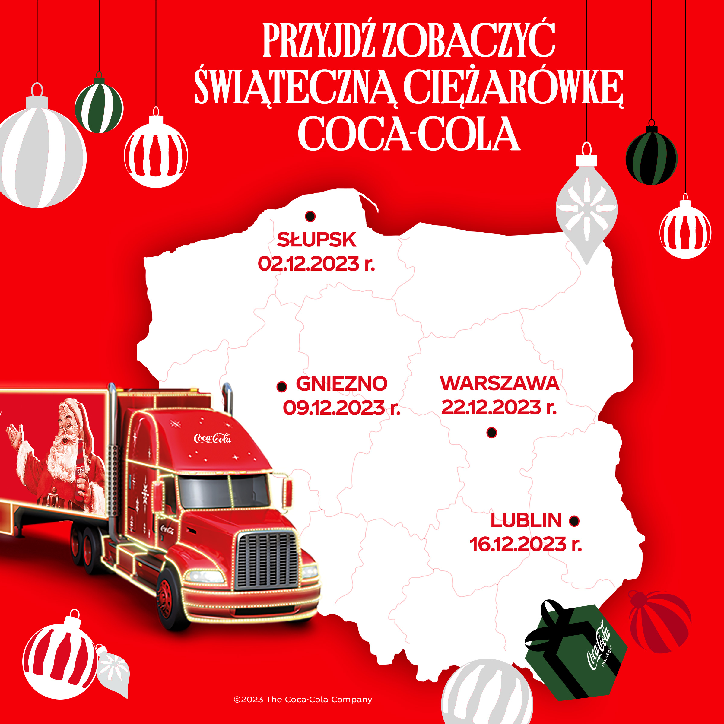 W tym roku marka ponownie zaplanowała moc atrakcji, aby wspólnie odliczać dni – już teraz zwiastuje początek sezonu w swój kultowy sposób, zapowiadając trasę czerwonej ciężarówki. Tym razem odwiedzi Słupsk (02.12), Gniezno (09.12), Lublin (16.12), Warszawę (22.12) oraz piąte miasto wybrane przez samych konsumentów w ramach głosowania w aplikacji Coca-Cola.