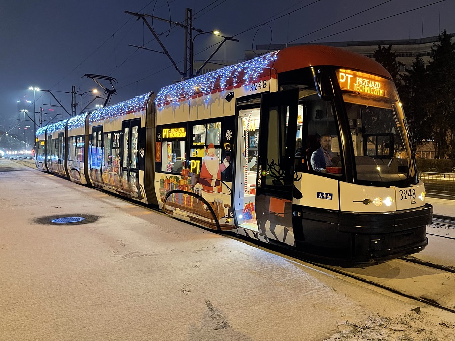 Na zewnątrz, pojazd znalazły się grafiki z długimi saniami, wraz z zaprzęgiem reniferów oraz morzem upominków. Skład ozdobią także liczne lampki, które sprawią, że będzie się on przepięknie prezentować także po zmroku. Pamiętaj, by wsiadając do świątecznego tramwaju, zajrzeć też do kabiny motorniczego – kto wie, może będziesz mieć szczęście i dojrzysz tam prawdziwego Świętego Mikołaja.