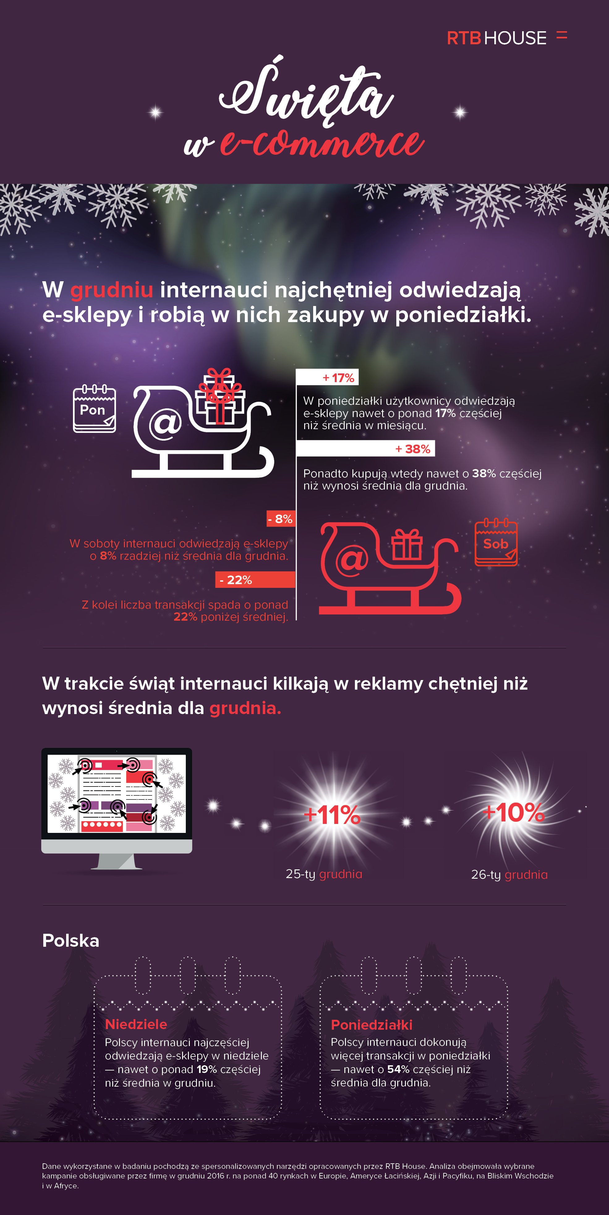Bezpośrednio w święta mało ludzi odwiedza sklepy internetowe, jednak osoby te często klikają w reklamy. W dniach 25 i 26 grudnia internauci robią to odpowiednio o prawie 11 proc. i 10 proc. chętniej niż średnia dla grudnia. Liczba kliknięć w reklamy, a także odwiedzin sklepów oraz liczby transakcji zaczyna z powrotem systematycznie rosnąć od razu po świętach.