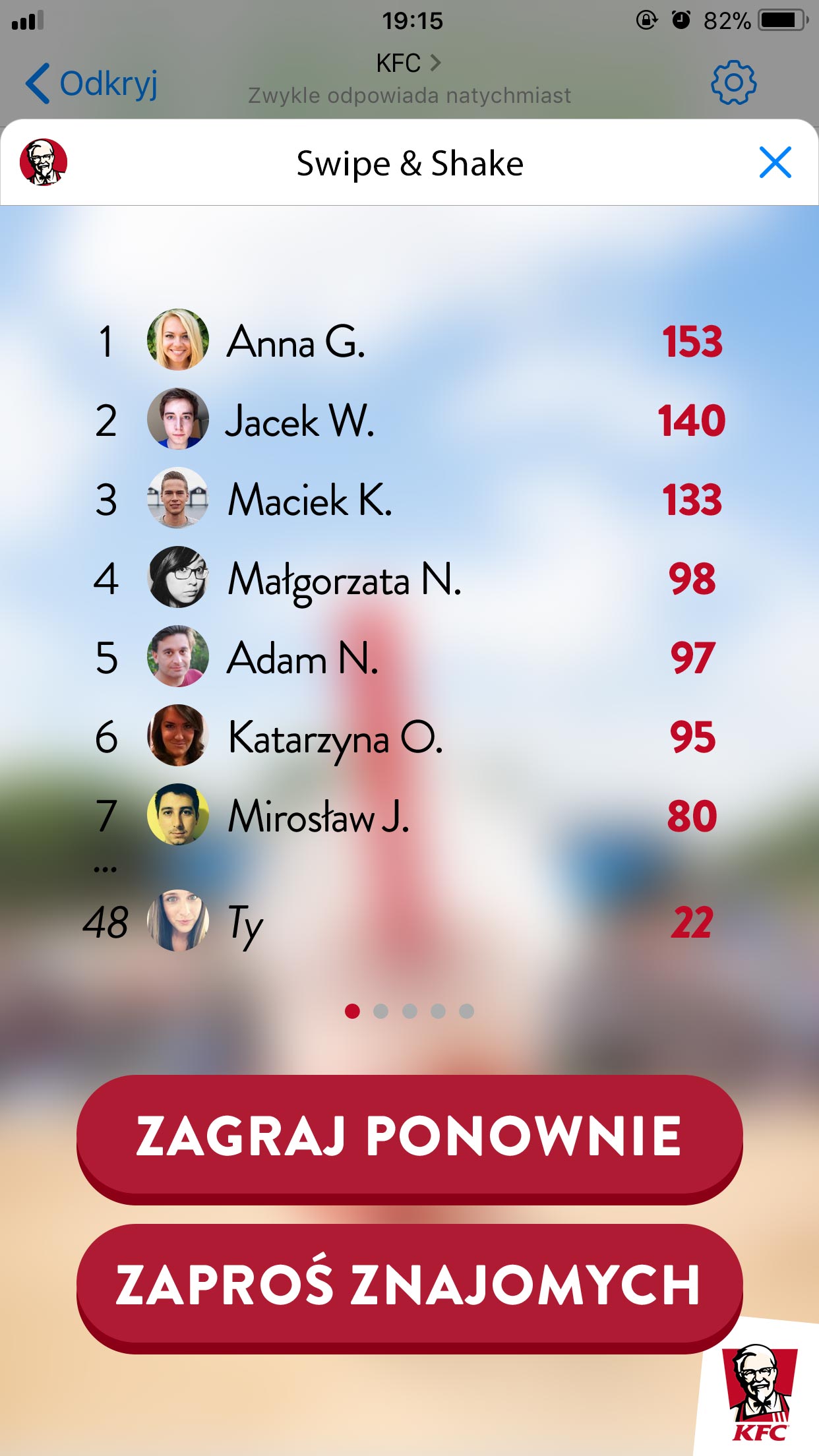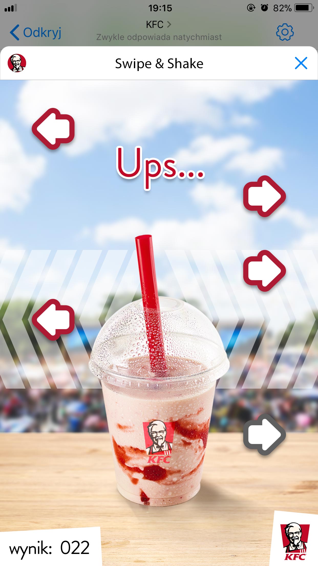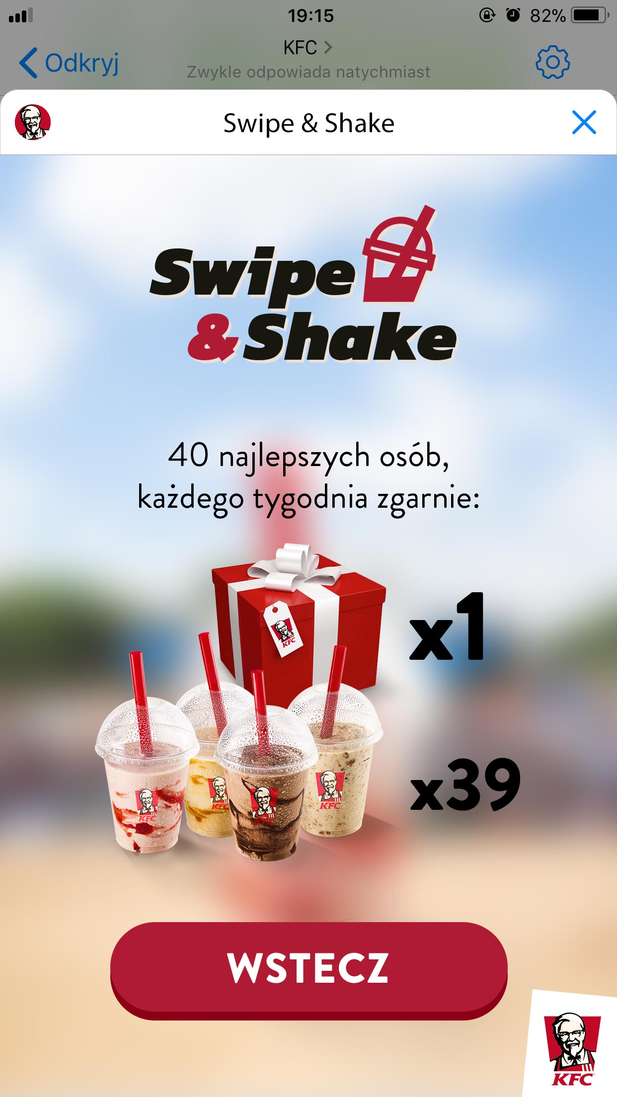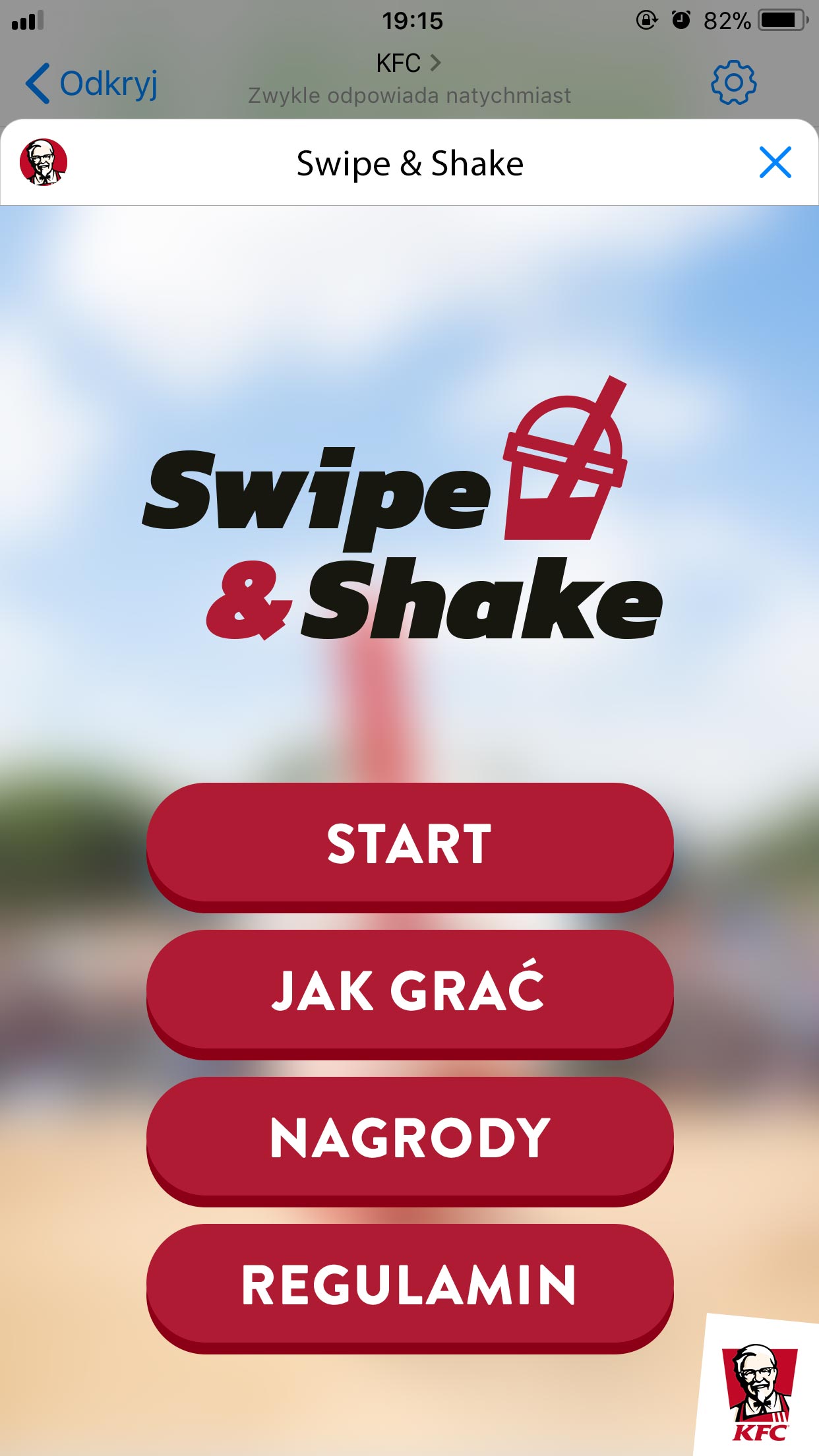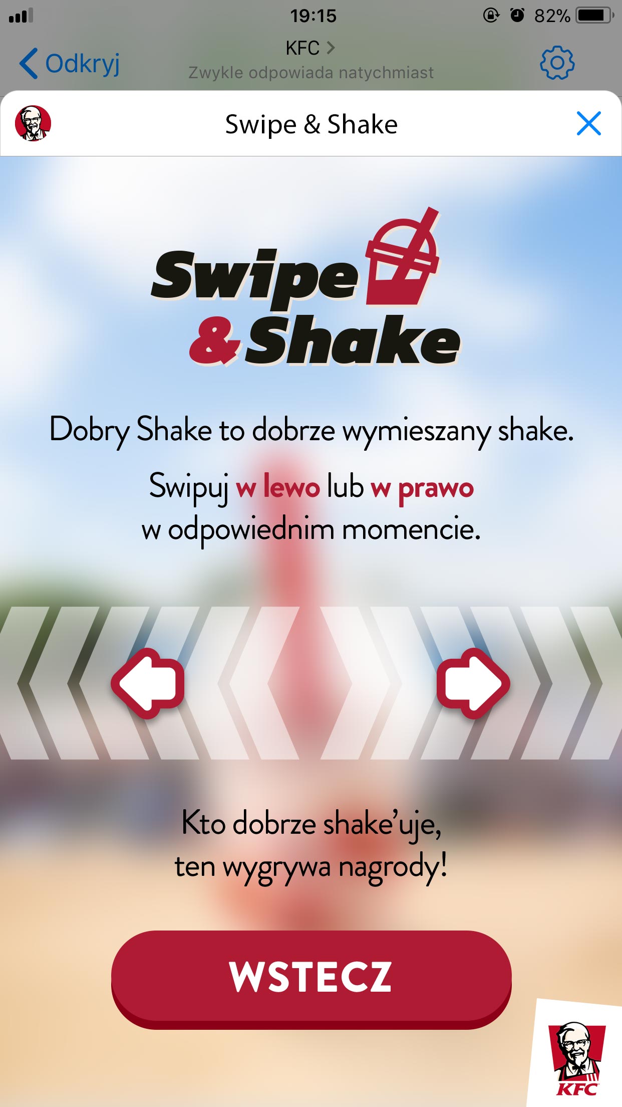 KFC od lat wyznacza trendy i zaskakuje swoich fanów oryginalnymi pomysłami. To pierwsza marka na polskim rynku, która w 2017 roku wypromowała swój produkt za pomocą gry w aplikacji Messenger. Dzięki prostej mechanice i dostępności na wszystkich systemach, w zeszłym roku marka zdobyła znaczące grono fanów. „Swipe & Shake” jest kontynuacją tych działań. KFC postanowiło ponownie sięgnąć po ten sam format i dostarczyć swoim Gościom rozrywki połączonej z elementem współzawodnictwa.