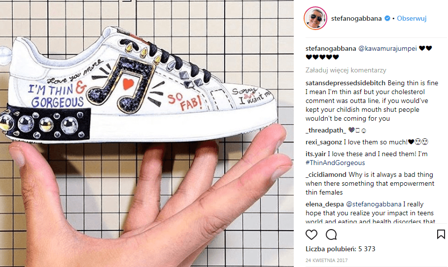 Kontrowersji nie uniknął też projekt butów sportowych od duetu Dolce&Gabbana. Spomiędzy wielu świecących ozdób, na obuwiu znalazł się napis “Jestem chudy i wspaniały”. W sieci zawrzało. Marka została oskarżona o umniejszanie wartości człowieka i promowanie anoreksji. Sam Stefano Gabbana nieszczególnie przejął się stawianymi mu zarzutami, a nawet żartobliwie zapowiedział, że kolejny jego projekt powstanie w myśl hasła “Love to be fat and full of cholesterol”.