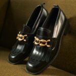 W kolekcji butów wyróżniają się lakierowane pantofle w stylu bitników, sztyblety z przyciemnia-nym noskiem albo klasycznie czarne, które z powodzeniem mogą być traktowane jako uniseksowe, czy też mokasyny ze złotą klamerką i frędzlami w stuprocentowo włoskim stylu.