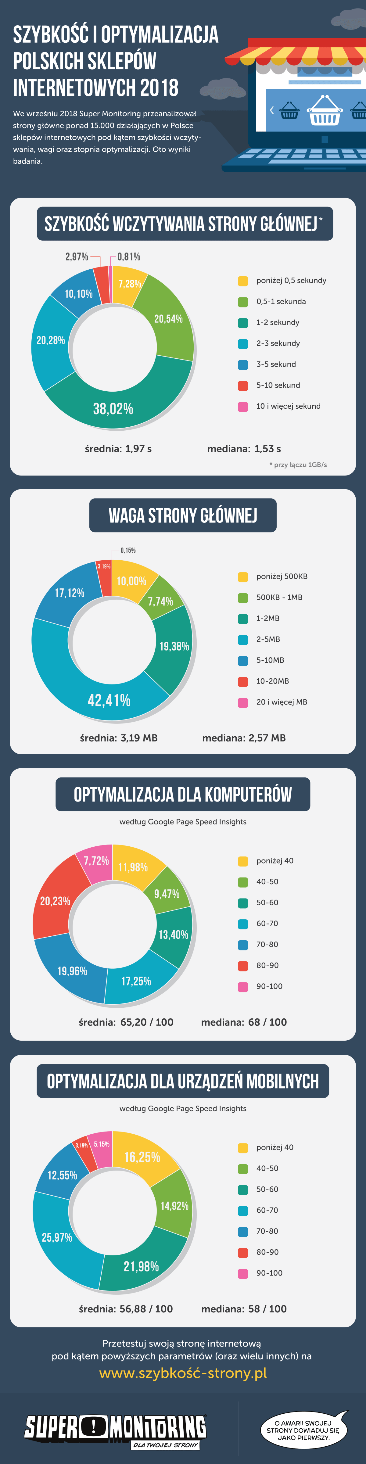 We wrześniu br. w ramach przeprowadzonego badania Super Monitoring przeanalizował strony główne około 15 500 działających w Polsce sklepów internetowych. W ramach analizy sprawdzono całkowity czas wczytywania się strony, liczono jej wagę oraz sprawdzano aktualne wskaźniki optymailizacji na komputery oraz urządzenia mobilne według Google Page Speed Insights.