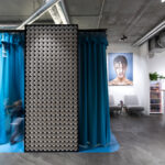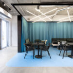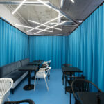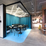 Strefa niebieska – którą od reszty kawiarni oddzielają zasłony i ścianki wykończone setkami tekturowych kubków. Tę część można naturalnie wydzielić pod większe zamknięte spotkania i warsztaty. Lampy nad tą strefą przybierają formę dużych hashtagów.