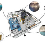 Na kawiarnię składają się niejako trzy różne scenografie, które różni od siebie zarówno zastosowanie odmiennych, nietypowych, wyrazistych materiałów oraz dobór trzech różnych zestawów kolorystycznych: