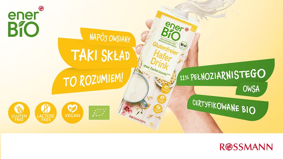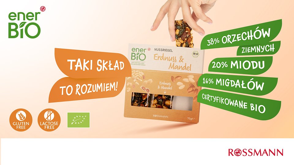 Produkty enerBIO, marki własnej Rossmanna, dostępne są w drogeriach Rossmann na terenie całego kraju. enerBIO oferuje najwyższej jakości produkty z certyfikatem bio. 95% składników pochodzi z ekologicznych upraw, do ich produkcji nie używa się produktów modyfikowanych genetycznie ani sztucznych polepszaczy. W ofercie enerBIO znajdziemy m.in. musli, napoje roślinne, suszone owoce, zdrowe batony i przekąski. „Taki skład to rozumiem” to pierwsza kampania marki enerBIO w Polsce.
