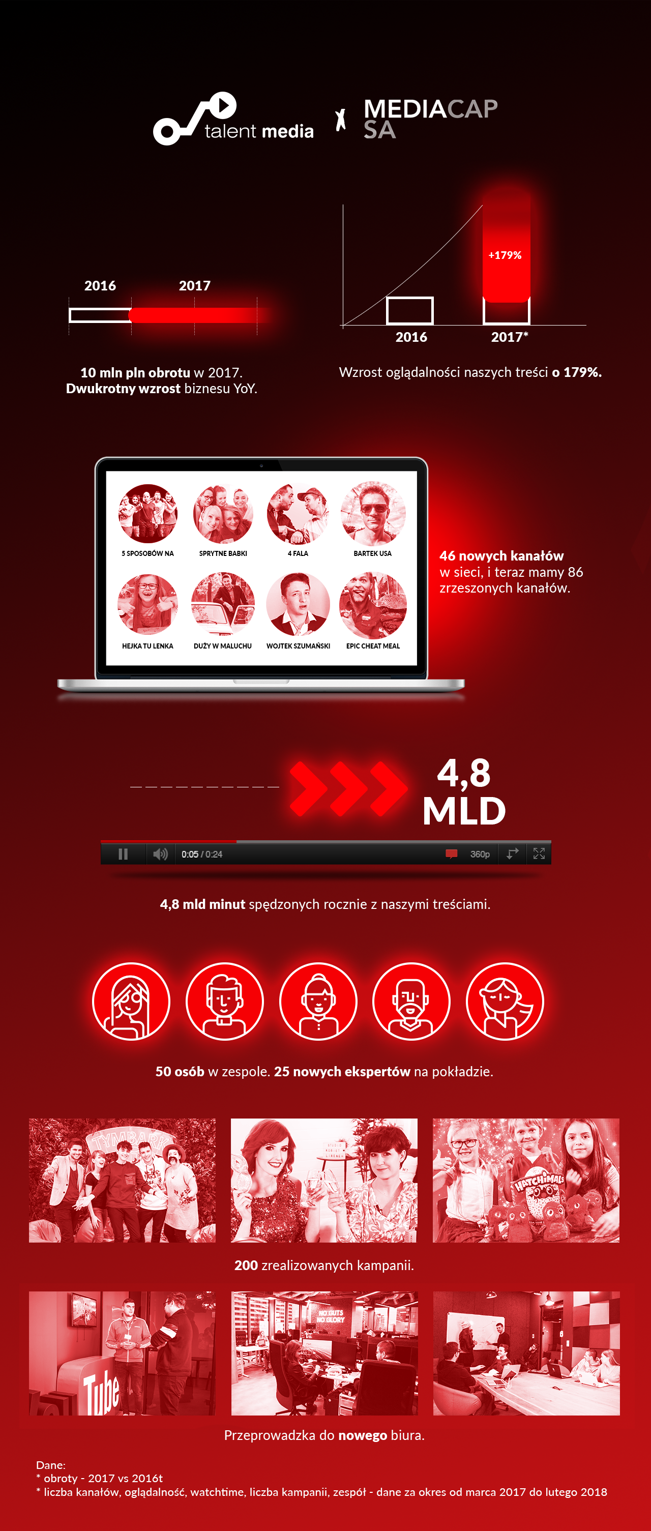 Miniony rok dla sieci partnerskiej TalentMedia okazał się rekordowy pod wieloma względami. Firma nie tylko zanotowała 10 mln obrotu odnotowując dwukrotny wzrost przychodów, ale także przeprowadziła największą w swojej historii liczbę kampanii – ponad 200 akcji dla klientów z bardzo różnych segmentów rynku. Średnia wartość jednego zrealizowanego projektu to ponad 45 tys. złotych, co plasuje TalentMedia na pierwszym miejscu spośród wszystkich MCN działających w Polsce. Warte odnotowania są również statystyki dotyczące liczby nowych kanałów – obecnie sieć skupia ich 86, co oznacza wzrost o 46 kanałów w badanym okresie. Większa liczba kanałów ma bezpośrednie przełożenie na wynik watchtime. Aktualnie to około 4,8 mld minut oglądalności treści generowanych przez influencerów TalentMedia (wzrost o 179 %) oraz łączna liczba wyświetleń wideo tych twórców na poziomie ponad 1,5 mld.
