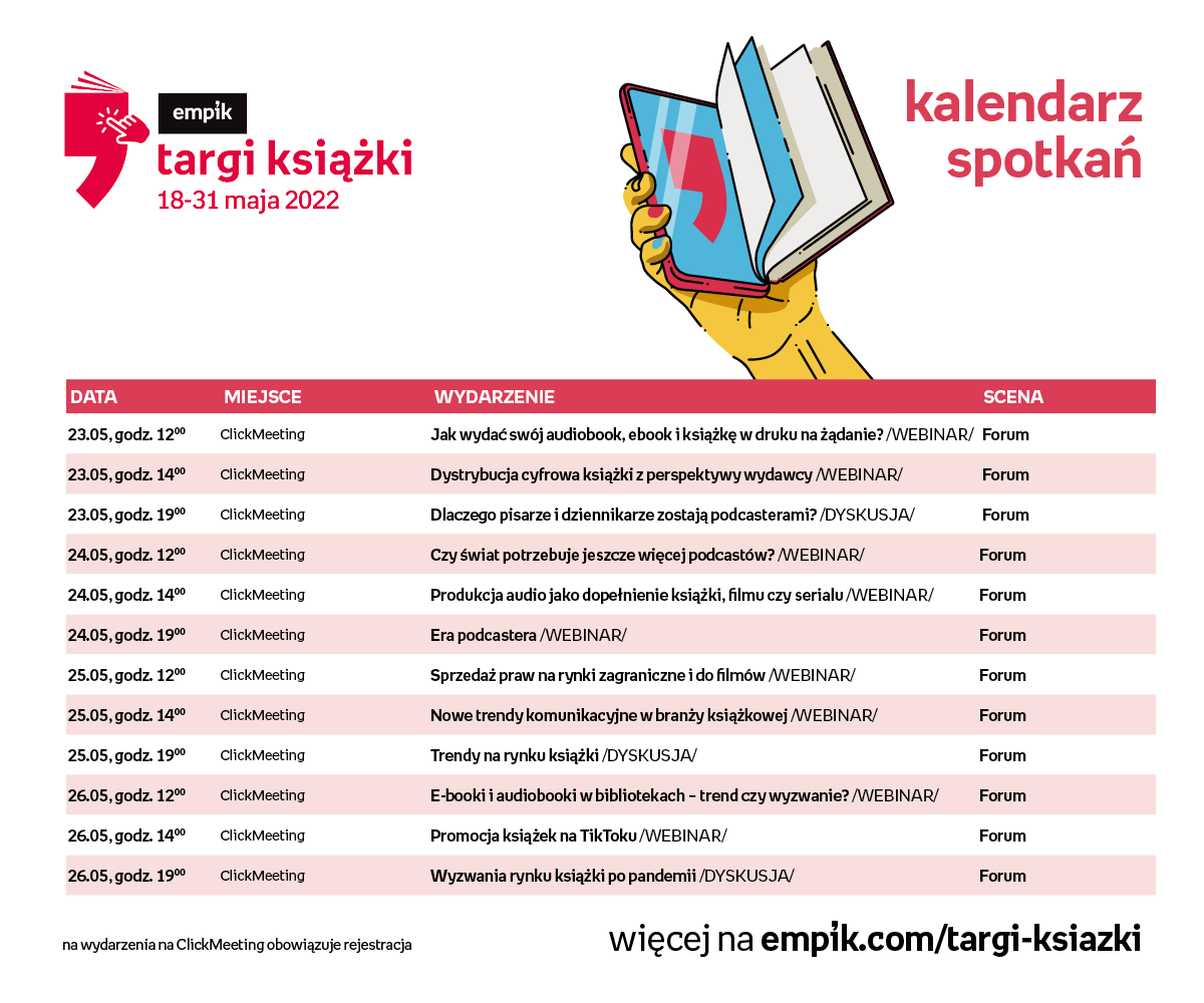 W trakcie webinarów i dyskusji zostaną poruszone również takie tematy, jak: druk na żądanie, sprzedaż praw zależnych czy obecność e-booków i audiobooków w bibliotekach. Specjaliści rynku wydawniczego zastanowią się podczas spotkań, na czym polega fenomen podcastów i dlaczego pisarze i dziennikarze uruchamiają własne audycje. Natomiast podczas webinarów będzie można dowiedzieć się, jak nagrać własny podcast i jak wykorzystać ten format jako narzędzie promocji książek, filmów i seriali.