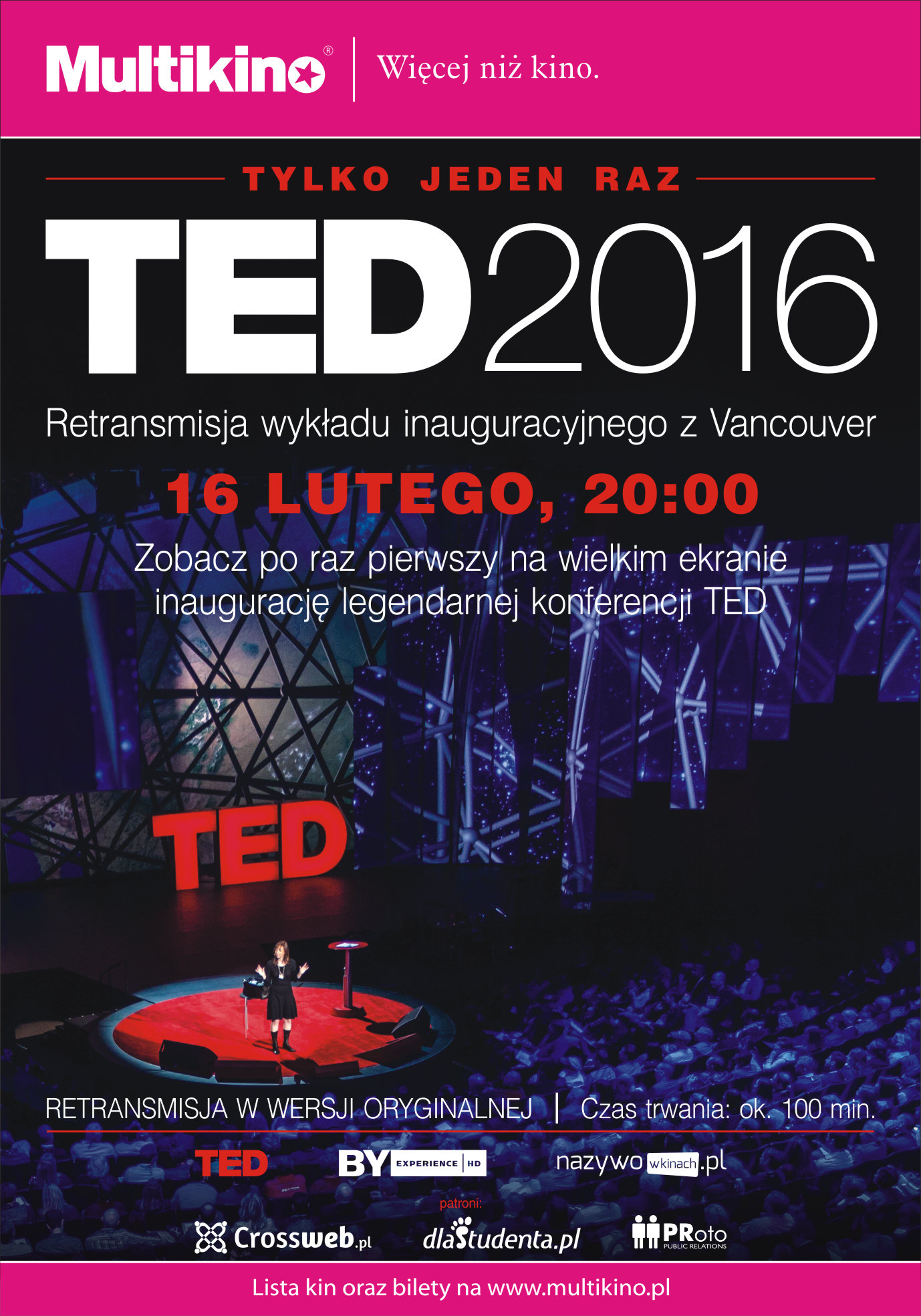 „TED 2016. Marzenie” odbędzie się w dniach 15–22 lutego w Vancouver. Inauguracyjny wykład będzie transmitowany w Ameryce Północnej 15 lutego i retransmitowany w Europie 16 lutego (ze względu na różnicę czasu). Wystąpią jak zawsze niezwykli wykładowcy, a całość zostanie poprzedzona częścią artystyczną.