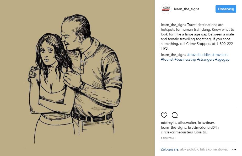 Tam istnieje pod nazwą @Learn_the_Signs, gdzie w dających do myślenia ilustracjach, informują podróżnych o znakach, które mogą świadczyć o zagrożeniu czyjegoś życia.