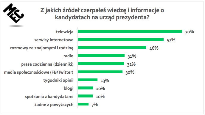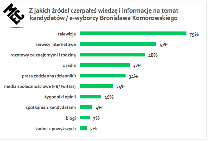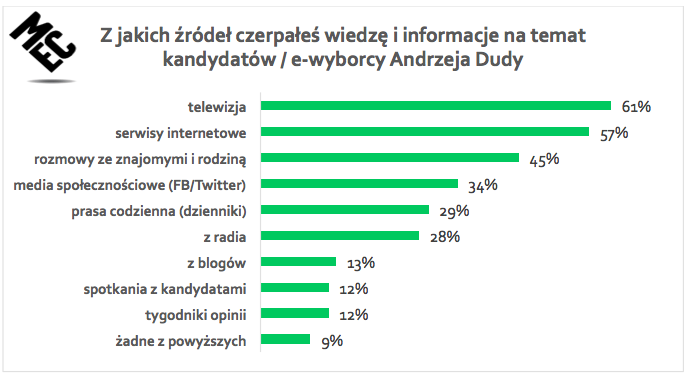Głosujący na Dudę z kolei znacznie częściej powoływali się na media społecznościowe, jako źródło wiedzy o kandydatach – social media były ich trzecim głównym (po telewizji i serwisach  internetowych, a przed dziennikami i radiem) kanałem. Przy interpretacji tych wyników należy oczywiście pamiętać o różnicującym te wskazania wieku e-wyborców obu kandydatów. Andrzej Duda, jak potwierdza badanie MEC, pozyskał większą liczbę młodych zwolenników.