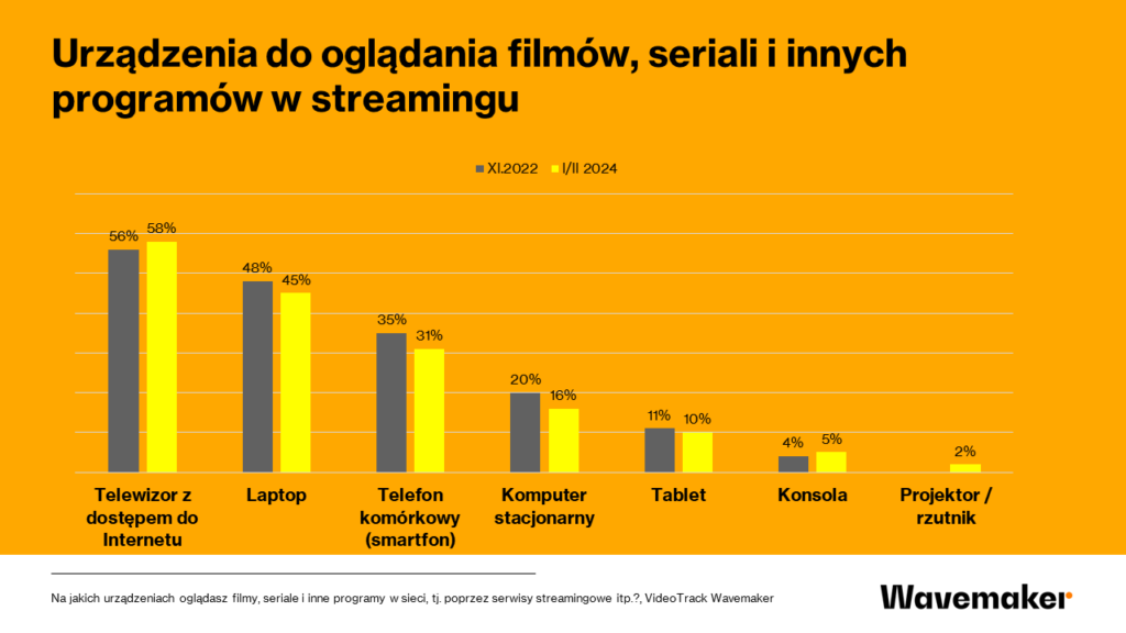 Telewizor zyskuje jako ekran do oglądania programów w serwisach streamingowych. Po tym, jak w 2022 r. Smart TV zdetronizował w Polsce laptop jako najpopularniejszy ekran do oglądania filmów, seriali i innego typu dłuższych programów online, z każdym kolejnym półroczem przybywało jego użytkowników, pokazują dane z VideoTrack, przekrojowego badania streamingu realizowanego przez agencję Wavemaker.
