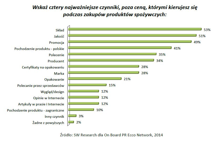 Pytania zadane respondentom sprawdzały również ich zwyczaje zakupowe. Wyniki pokazują, że skład (53%) oraz jakość (51%) to czynniki determinujące wybór konkretnego produktu spożywczego. Marka ma znaczenie dla jedynie 28% badanych. Czy jest to dowód na coraz popularniejszy trend „transparentności”, zgodnie z którym konsumenci chcą być świadomi tego co jedzą, a marka produktu jest czynnikiem drugorzędnym?