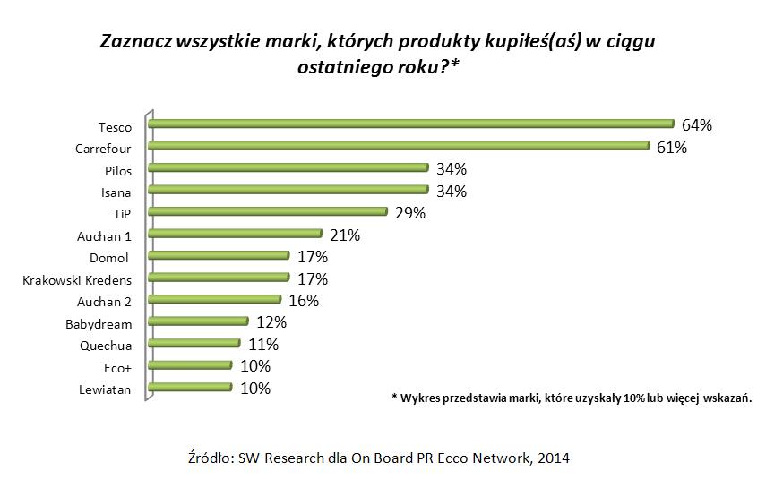 Tesco, Carrefour, Pilos oraz Isana to najczęściej kupowane marki własne. Na kolejnych miejscach znalazły się: TiP (29%), Auchan-logo z kciukiem (21%), Domol (17%), Krakowski Kredens (17%), Auchan-logo z ptaszkiem (16%), Babydream (12%) oraz Quechua (11%). Jedynie 5% respondentów zadeklarowało, że nie kupiło produktów żadnej marki własnej. Na uwagę zasługuje również fakt, że jedynie 1% badanych zapytanych „Które z wymienionych marek określił(a)byś jako marki własne wybranych sieci handlowych?” wybrało prawidłową odpowiedź „wszystkie wymienione marki”.