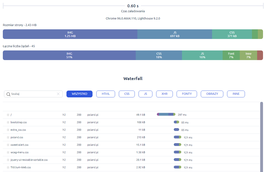 Oprócz informacji, które są istotne dla przeciętnego właściciela strony internetowej, raporty prezentowane przez test2speed.com pozwalają na sprawdzenie szczegółowych informacji o witrynie. Dowiemy się z nich, jaką trasę pokonują pakiety w sieci IP wysyłane z serwera testującego do badanej strony WWW i jakie towarzyszą temu opóźnienia. A ponieważ szybkość wczytywania strony zależy zarówno od tych opóźnień na trasie pakietów, jak i od ilości przesyłanych danych oraz od liczby elementów tworzących stronę, test2speed.com dodatkowo określi strukturę strony według typu tworzących ją danych, a dzięki analizie waterfall można szybko wyłapać opóźnienia we wczytywaniu elementów strony oraz wskazać jej składniki, które zwracają błędy.