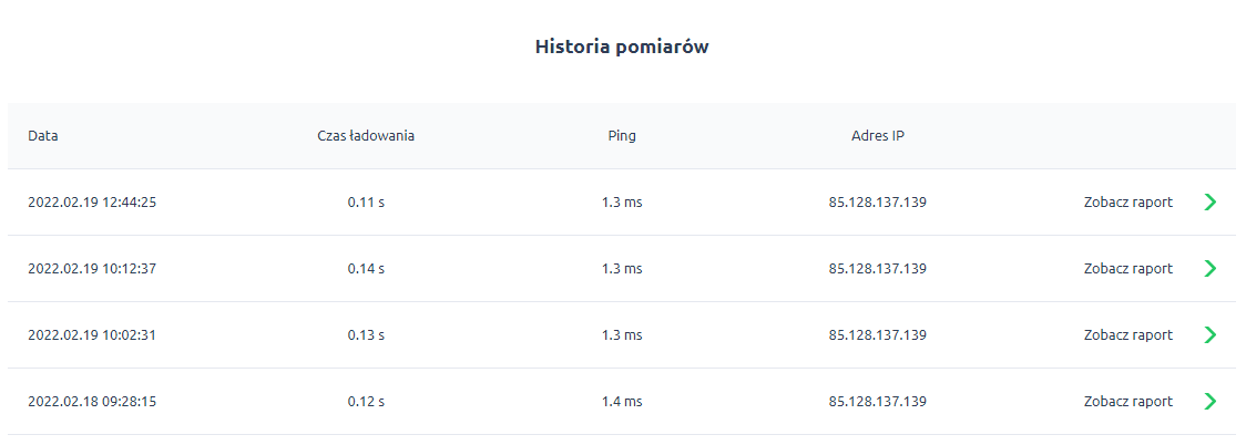 W każdej chwili, bez konieczności przeprowadzania nowego badania, test2speed.com pozwala wyszukać archiwalne raporty dla witryn, które były za jego pomocą testowane. W historii prezentowane jest zawsze ostatnie 30 wyników, ale pojedyncze raporty, do których można skopiować sobie link, są dodatkowo przechowywane w systemie, niezależnie od wyświetlanej tu listy.