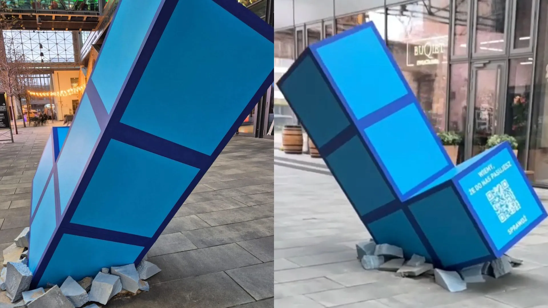Tym sposobem, początkowo w Fabryce Norblina, a następnie w Elektrowni Powiśle pojawił się niebieski klocek w kształcie litery „L”, przypominający element z kultowej gry Tetris. Tym razem jednak nie spada on z ekranu telefonu, a wygląda jakby uderzył w chodnik z dużej wysokości i z impetem wbił się w ziemię, pozostawiając pęknięcia.