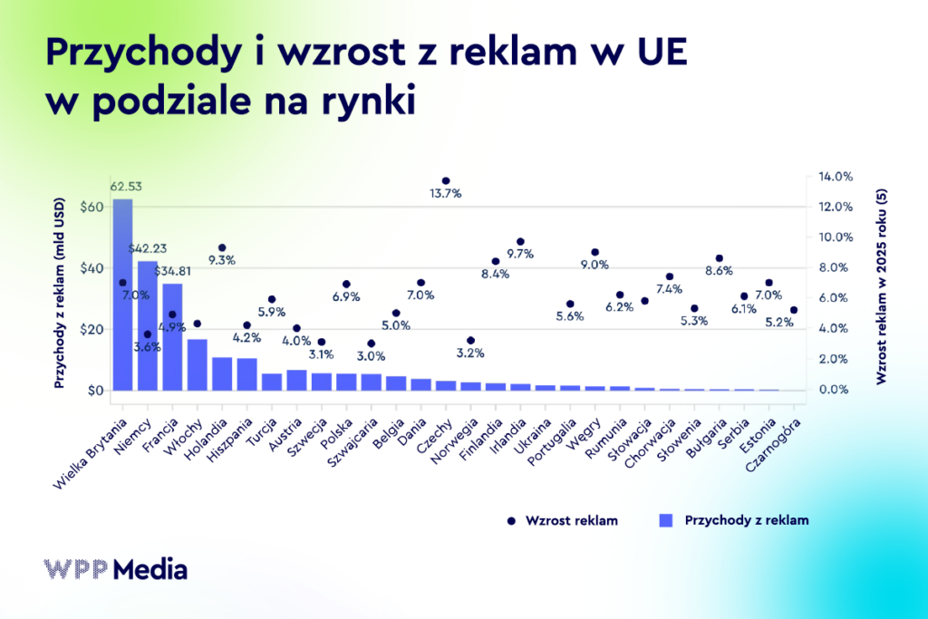 Europejski rynek reklamowy wzrośnie w 2025 roku o 5,8%, osiągając wartość 257,6 mld dolarów. Na 2026 rok prognozowany jest dalszy wzrost o 5,5%.