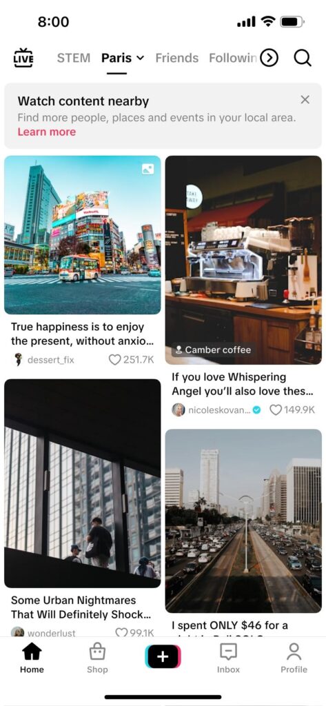 Funkcja Nearby Feed pomaga użytkownikom sprawdzić, co ciekawego dzieje się w ich okolicy. Mowa tutaj nie tylko o lokalnych twórcach, ale również popularnych wśród społeczności miejscach. TikTok sam będzie wyświetlał odpowiednie dla lokalizacji treści.