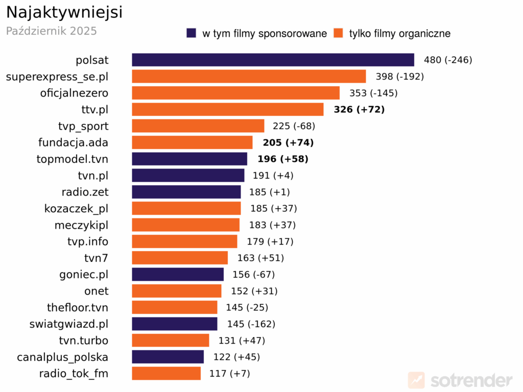 Październik upłynął pod znakiem mniejszej aktywności. Polsat wciąż prowadzi w rankingu, mimo że opublikował o 246 filmów mniej niż miesiąc wcześniej. Na drugim miejscu Super Express z wynikiem 398 filmów, a tuż za nim Oficjalne Zero – 353 publikacje. Najbardziej aktywność wzmocniły profile Fundacji ADA (+74 wpisy), TTV (o 72 posty więcej) i Top Model (+58 publikacji).