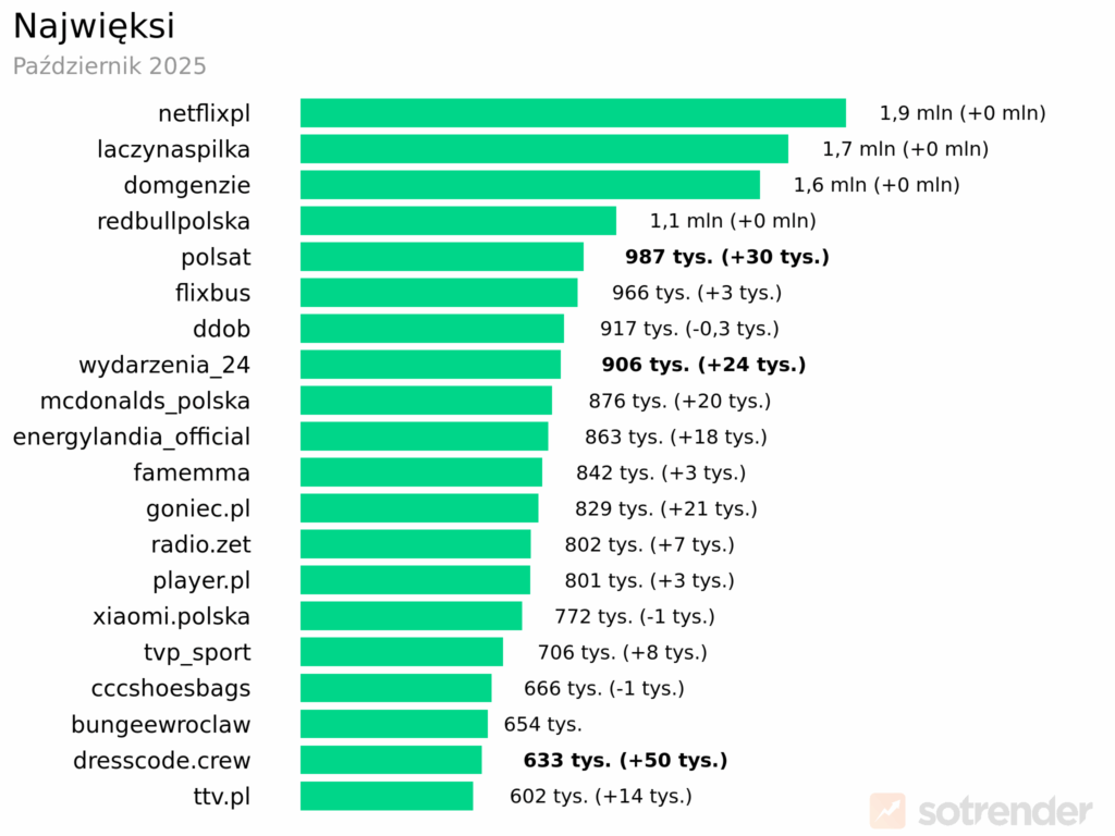 Netflix nie ma sobie równych w tej kategorii – utrzymuje pozycję lidera z wynikiem 1,9 mln obserwujących, choć tempo wzrostu wyraźnie zwolniło. Za nim wciąż Łączy nas piłka (1,7 mln) i @domgenzie (1,6 mln). Największe wzrosty obserwujących zanotowały profile @dresscode.crew (+50 tys.), Polsat, który awansował o 30 tys. obserwujących i wskoczył na 5. lokatę z wynikiem 987 tys. i @wydarzenia_24 (+24 tys.).