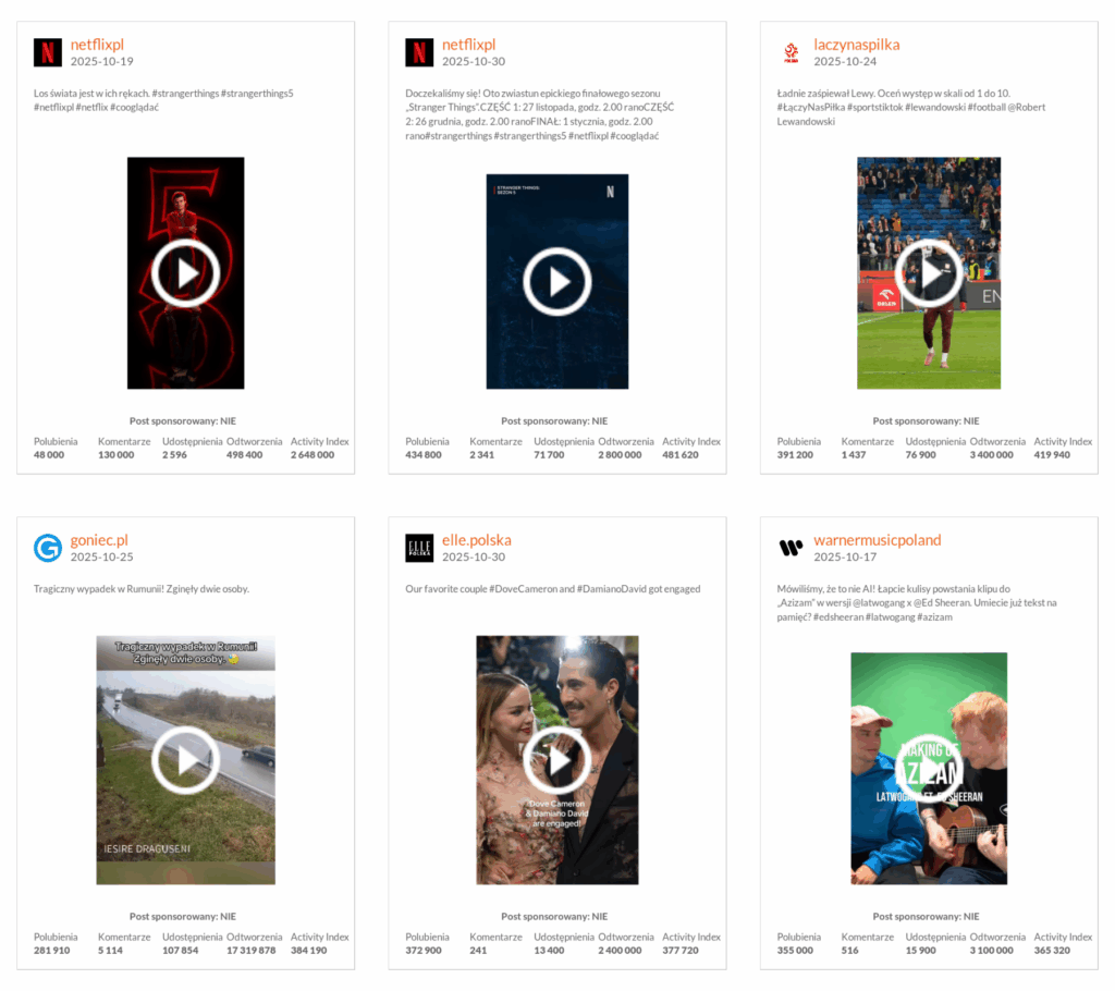 Netflix po raz kolejny udowodnił, że ma patent na viralowe premiery. Zapowiedzi finałowego sezonu serialu „Stranger Things” znalazły się na dwóch czołowych miejscach wśród najlepszych postów miesiąca pod względem Activity Index – najlepszy zanotował imponujący wynik ponad 2,6 mln. Łączy nas piłka przypomniało, jak wielkie emocje budzi Robert Lewandowski – ich wideo z jego występem znalazło się na 3. pozycji. Co ciekawe, żaden z postów nie był sponsorowany.