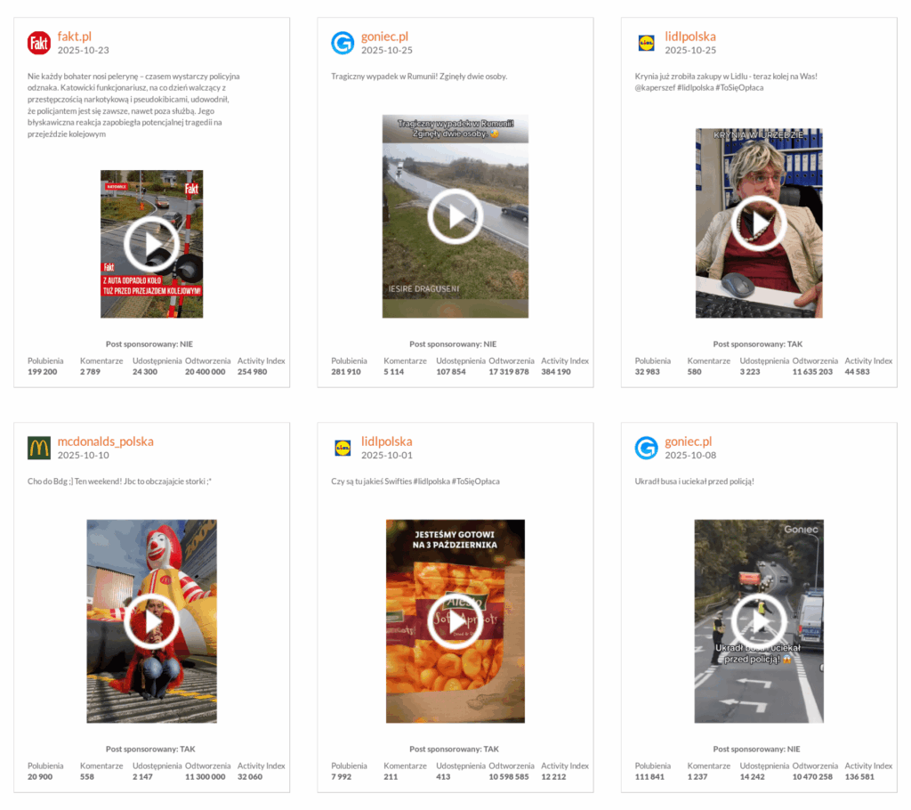 Październik potwierdził, że krótkie, emocjonalne wideo newsy nadal są jednym z najskuteczniejszych formatów w mediach społecznościowych. Najlepszym postem pod względem liczby odtworzeń było wideo Faktu. Materiał o policjancie, który uratował kobietę z auta na przejeździe kolejowym – został obejrzany ponad 20 mln razy. W czołówce najczęściej wyświetlanych materiałów znalazł się także Goniec.pl. Ich relacja relacja z wypadku w Rumunii znalazła się na 2. miejscu z ponad 17 mln odtworzeń. Ich drugi film, tym razem o ucieczce kierowcy przed policją, który zebrał ponad 10 mln odtworzeń, znalazł się na miejscu 6. Na podium nie mogło zabraknąć także humorystycznego contentu z profilu Lidla, który został obejrzany ponad 11 mln razy.