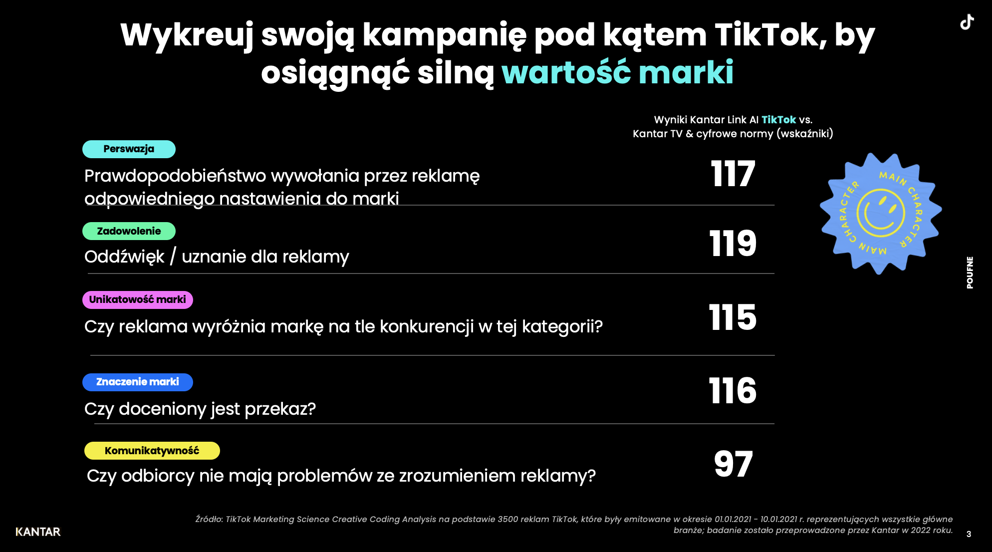 Według analizy Kantar LinkAI ponad 3500 zbadanych reklam na TikToku przekroczyło założone normy cyfrowe i telewizyjne o 15–20%. Dotyczy to wielu różnych wskaźników, w tym: perswazji (prawdopodobieństwa, że reklama wywoła odpowiednie nastawienie u odbiorcy), znaczenia marki (docenianie przekazu) oraz przyjemności związanej z interakcją (realizacja i oddziaływanie reklamy). Mówiąc prościej: reklamy lubiane przez widzów są skuteczniejsze [5].