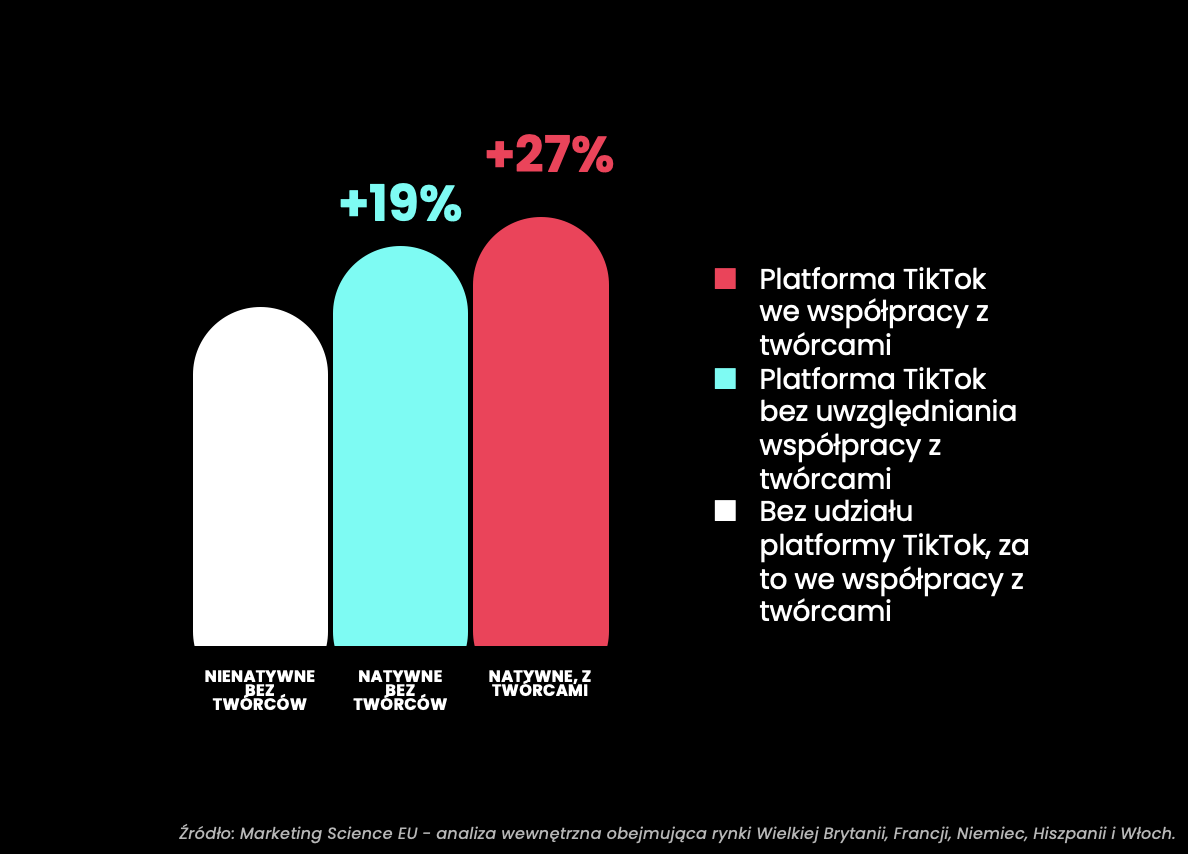Kreacje, które od samego początku są przeznaczone dla użytkowników TikToka, zwiększają zapamiętywalność reklam o ponad 19% (źródło: badanie własne). Wynik ten może być jeszcze lepszy, gdy dojdzie do tego współpraca z twórcami – wtedy zapamiętywalność reklam przekracza 27% [6].