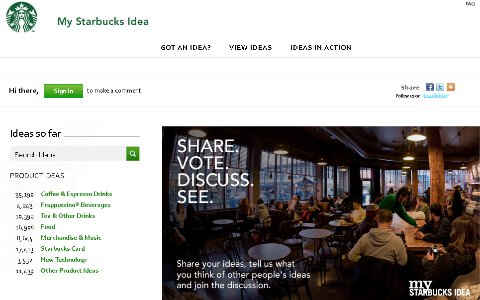 Kolejnym dobrym przykładem jest Starbucks, firma uruchomiła w 2008 roku serwis mystarbucksidea.com, pozwalający konsumentom na zgłaszanie pomysłów na rozwój kawiarni. Do momentu uruchomienia serwisu sieć otrzymywała od swoich klientów wiele skarg, nad którymi ciężko było jej zapanować. Uruchomiona strona pozwoliła na poświęcenie uwagi sprawom najistotniejszym z punktu widzenia konsumentów, dzięki zastosowanym na niej mechanizmom (komentarze, głosowanie na najlepsze pomysły). Za sprawą projektu, w lokalach wprowadzono już około 300 zmian i ulepszeń, a najaktywniejsze – najbardziej kreatywne osoby, otrzymały stałe rabaty na produkty kawiarni.