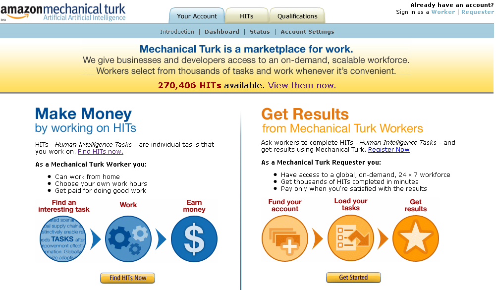 Za przykład wykorzystania crowdworkingu może z kolei posłużyć, stworzony w 2005 roku, serwis Amazon Mechanical Turk, który łączy ze sobą osoby posiadające różnorodne prace do zrealizowania, oraz ich wykonawców. Zamieszczane w serwisie prace, nazywane HIT (Human Intelligence Task), wyświetlane są na liście zleceń, zleceniobiorcy przeglądają dostępne oferty i wybierają te, które chcą wykonać. Zleceniodawcy otrzymują wyniki ich pracy, sprawdzają czy spełniają one ich oczekiwania i płacą tylko za te, które są zgodne z opisem zlecenia. Przy każdym ogłoszeniu znajduje się informacja na temat wynagrodzenia, czasu na realizację zlecenia, jego opis, a także ile osób może je wykonać – często jedno zadanie zrealizować może nawet kilka-kilkanaście tysięcy wykonawców. Dzięki tego typu serwisom nawet małe i średnie przedsiębiorstwa, w niedługim czasie, oraz przy niskim budżecie zorganizować mogą efektywne akcje marketingowe. Oprócz tradycyjnych prac, z których skorzystać mogą przedsiębiorstwa, serwis używany może być także do realizacji innego rodzaju celów, jednym z ciekawych przykładów jest jego wykorzystywanie w przypadku poszukiwania zaginionych osób.