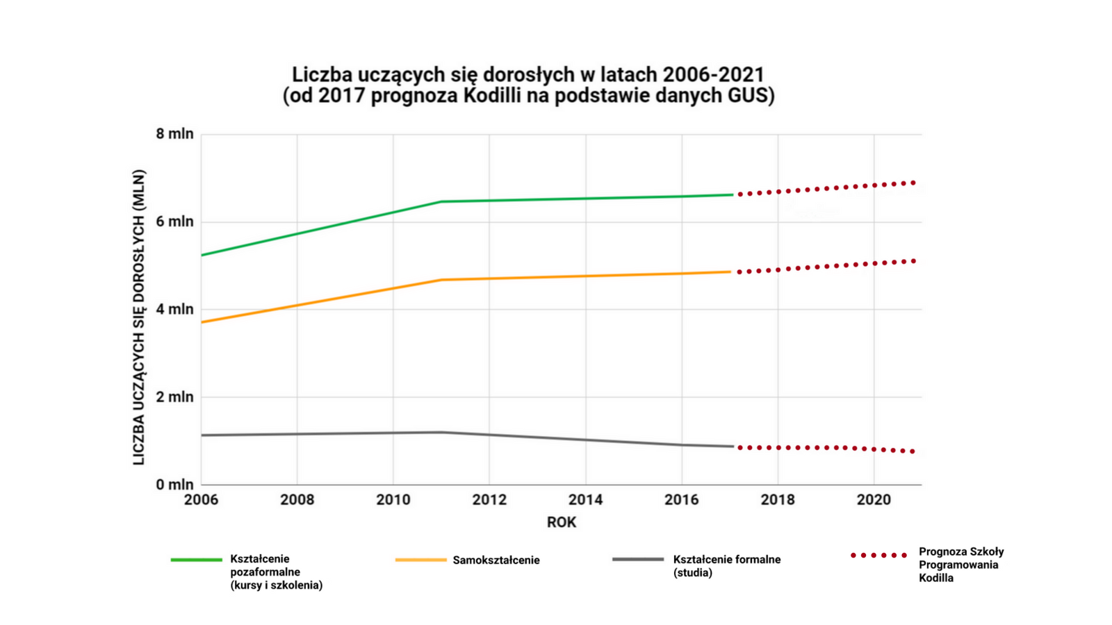 Zgodnie z danymi GUS, od 2006 roku spada liczba osób wybierających studiowanie, rośnie z kolei odsetek Polaków uczących się samodzielnie oraz korzystających z kursów i szkoleń. Jeżeli prognozy ekspertów z Kodilla.com potwierdzą się, trend utrzyma się przynajmniej do 2021 roku.