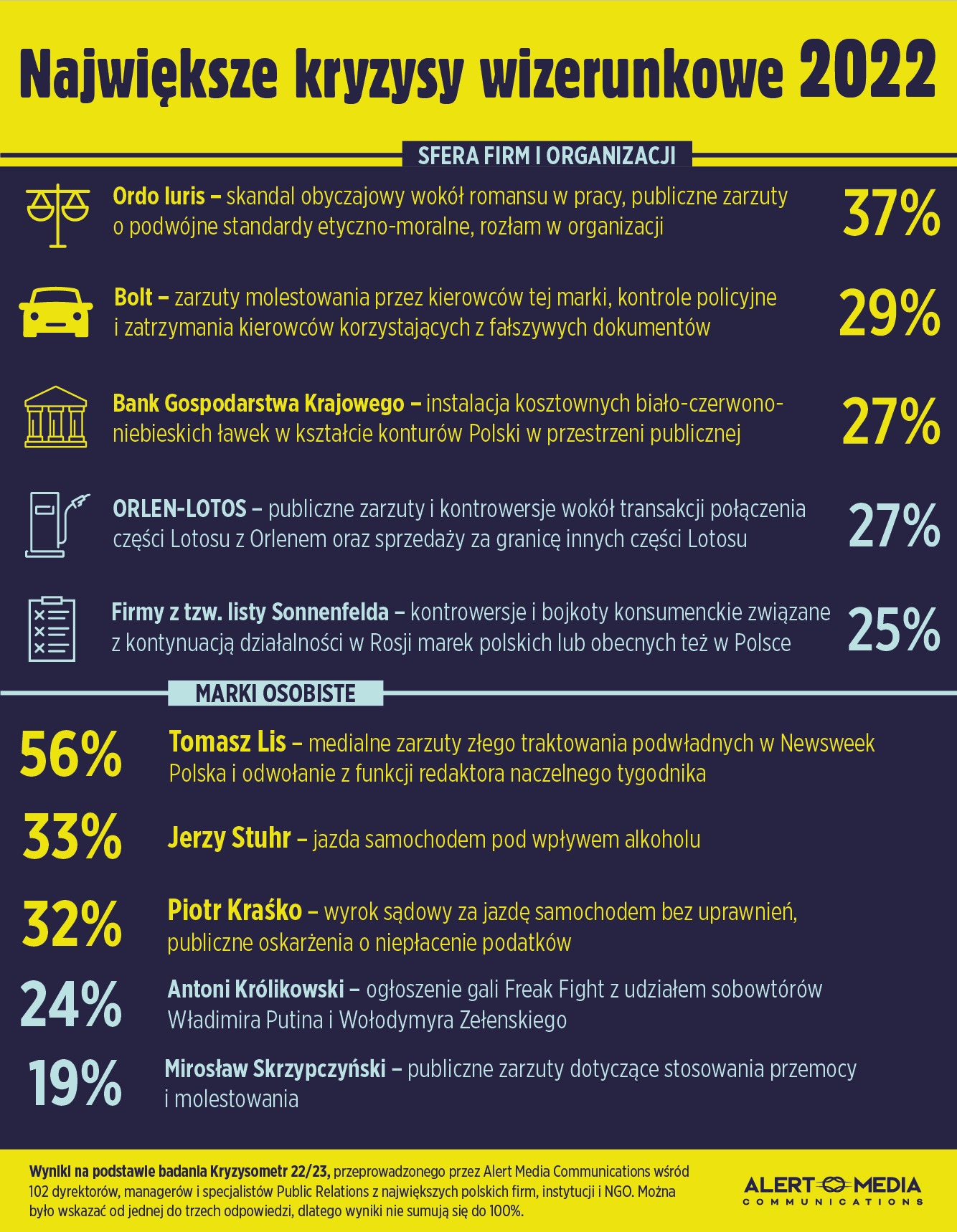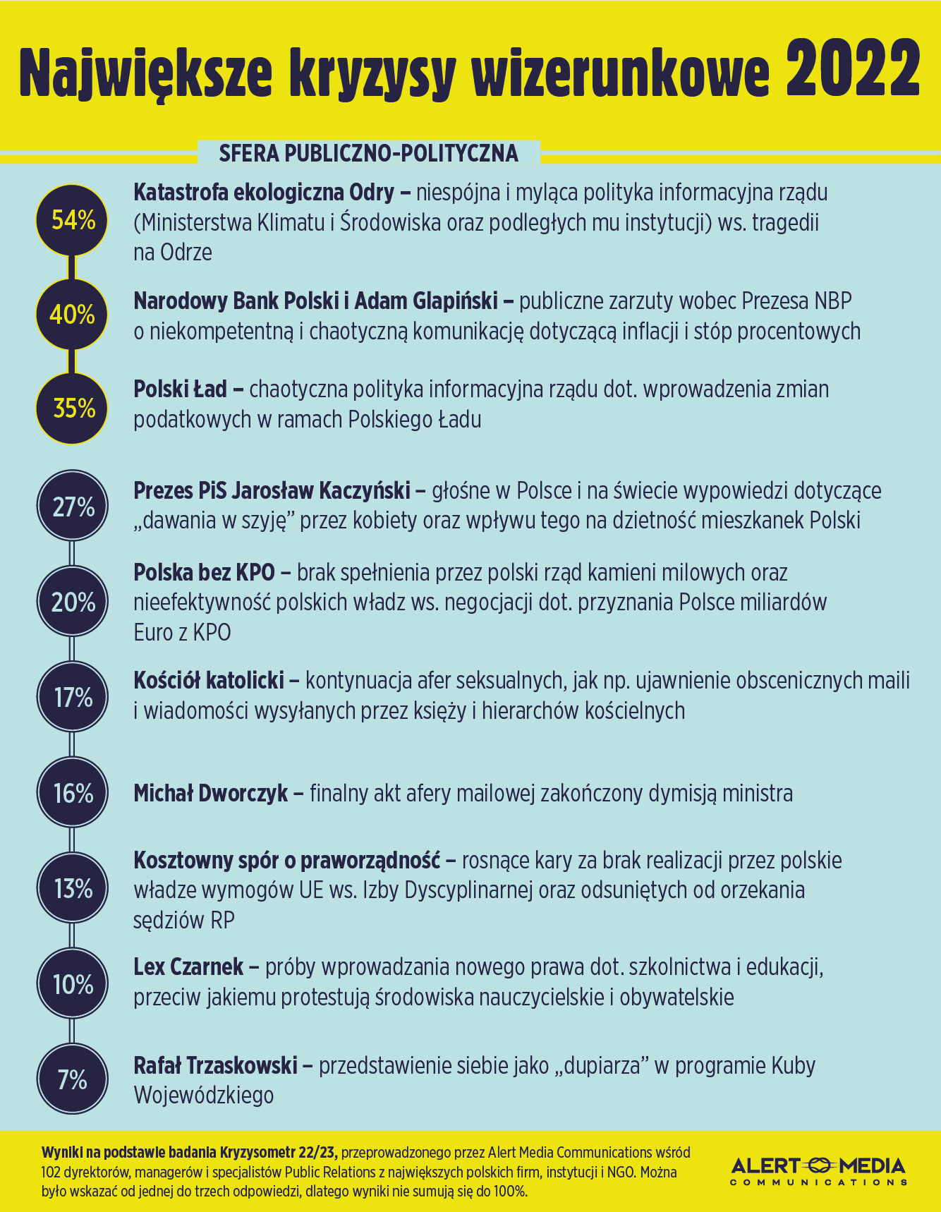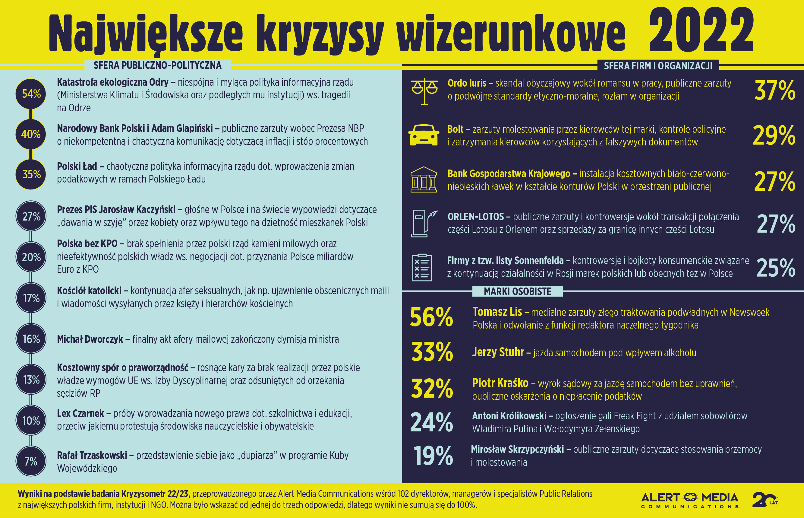 Największy kryzys wizerunkowy 2022 roku w polskim świecie publicznym to katastrofa ekologiczna na Odrze i towarzysząca jej nietransparentna polityka rządu. W gronie firm i organizacji – skandal obyczajowy i rozłam w Ordo Iuris, natomiast w sferze marek osobistych na pierwszym miejscu znalazł się Tomasz Lis – w związku z medialnymi zarzutami dot. sposobu traktowania podwładnych w Newsweek Polska.