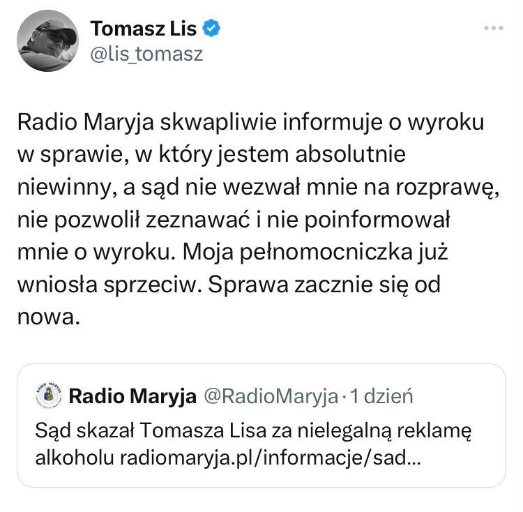 Jestem absolutnie niewinny, a sąd nie wezwał mnie na rozprawę, nie pozwolił zeznawać i nie poinformował mnie o wyroku – podkreślił Lis we wpisie.