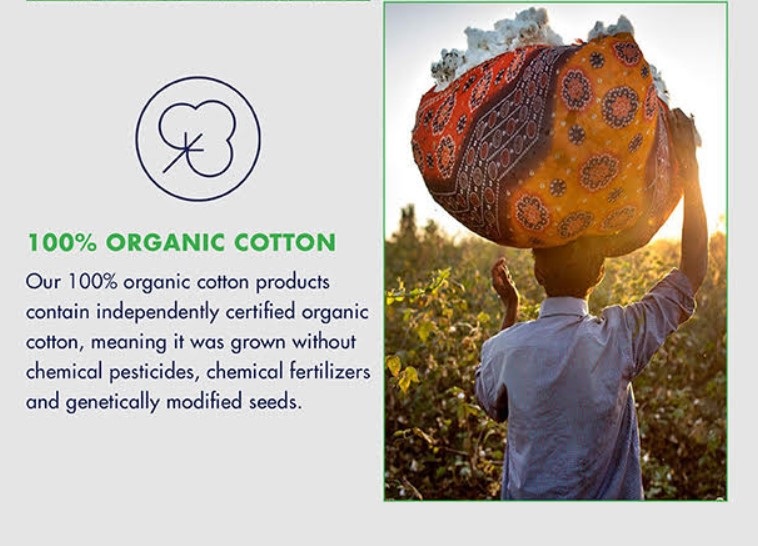 100% Organic Cotton – Produkty brandu produkty są wykonane w 100% z organicznej bawełny, co oznacza że była ona uprawiana bez użycia pestycydów, nawozów chemicznych i nasion modyfikowanych genetycznie.
