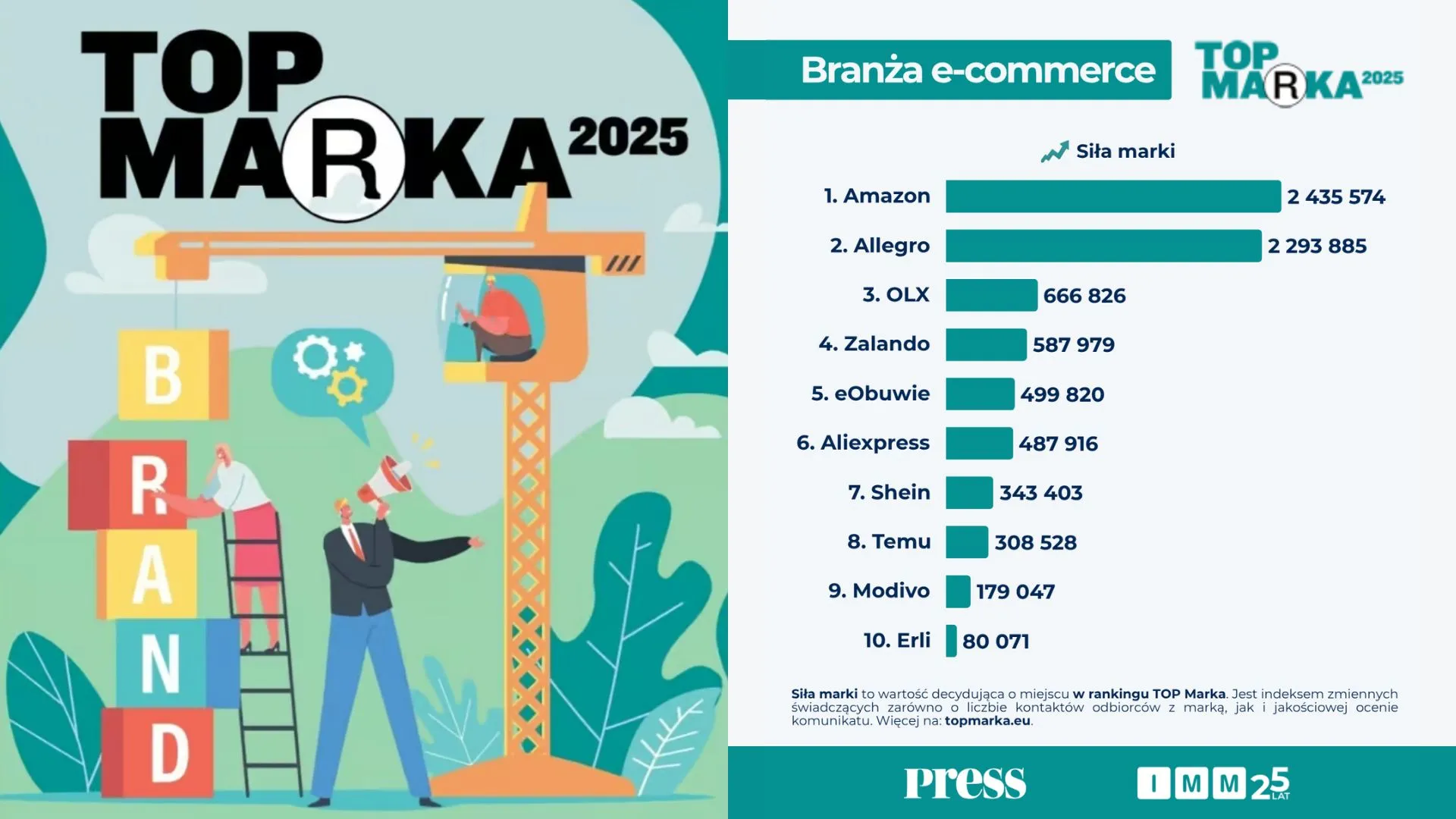 Pierwsze miejsce w rankingu Top Marka 2025 zajął Amazon, z siłą marki wynoszącą 2 435 574 punktów. Amazon złożył ofertę kupna amerykańskiego oddziału aplikacji TikTok, która zgodnie z decyzją administracji Donalda Trumpa miała w USA mieć amerykańskiego właściciela.