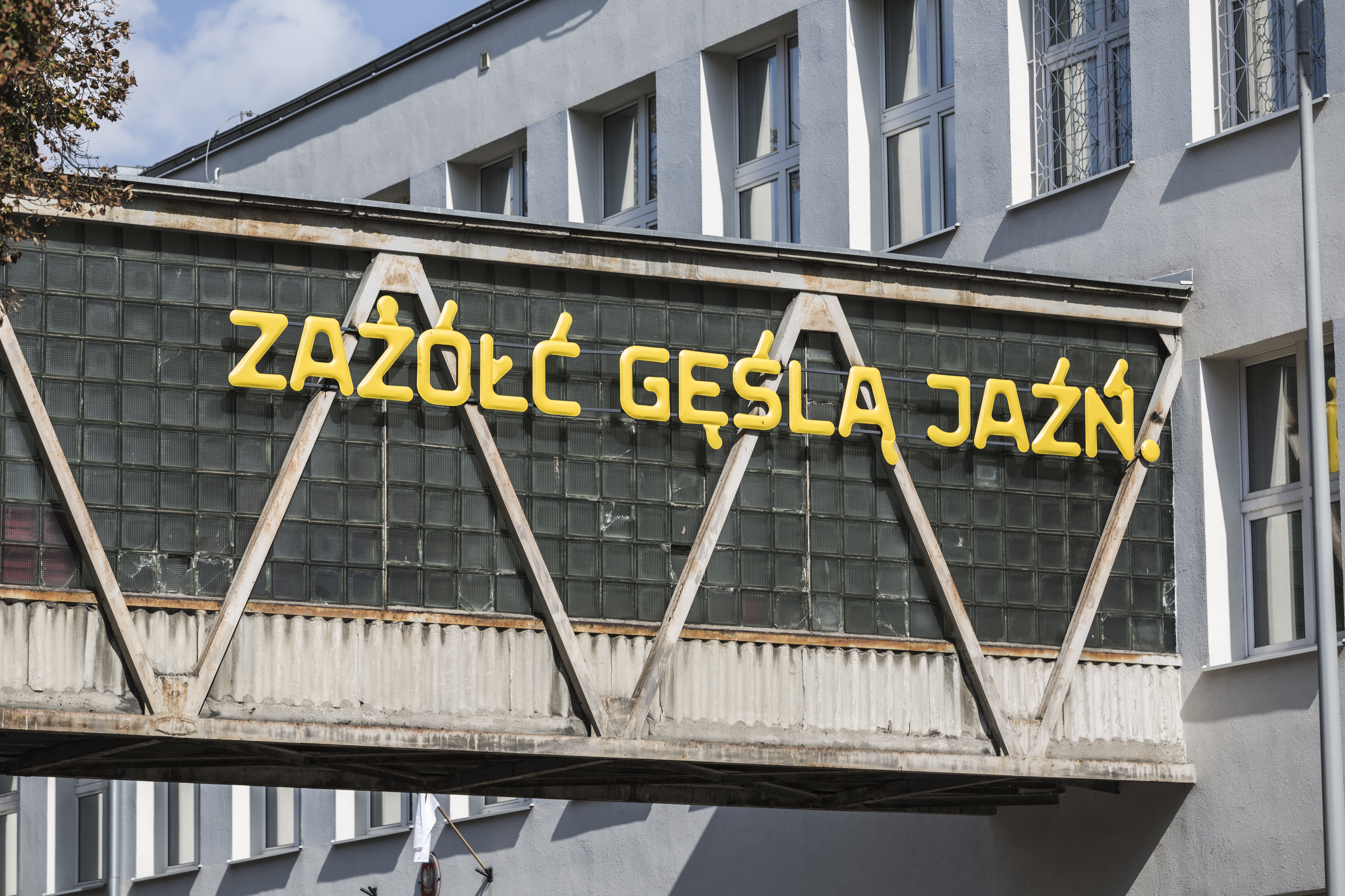 Podczas tegorocznego festiwalu Biennale Sztuki Miejskiej gdyńskie stowarzyszenie Traffic Design stworzyło 7 nowych realizacji artystycznych, które pojawiły się w przestrzeni miejskiej Gdyni. Jedną z nim jest luksferowy łącznik między budynkami nad ulicą Żeromskiego, który zdobią litery zaprojektowane przez Threedotstype i zrealizowane w technologii jednego z najbardziej uznanych polskich projektantów Oskara Zięty, układające się w naszpikowane polskimi znakami diakrytycznymi zdanie „Zażółć gęślą jaźń”.