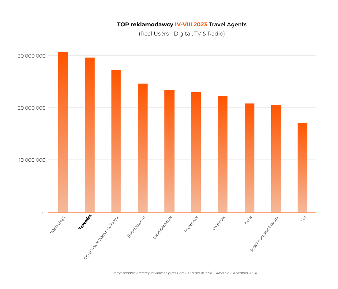 – To ogromny sukces, ponieważ już kolejny rok z rzędu znajdujemy się w czołówce reklamodawców z branży turystycznej w Polsce. W ubiegłym roku za sprawą samej reklamy internetowej dotarliśmy do blisko 24 mln użytkowników. Tym razem, uwzględniając również telewizję, do ponad 29,6 mln osób. Dane te pokazują, że nasze działania marketingowe przynoszą zauważalne efekty. Branża po pandemii wyraźnie się ożywiła. Ludzie coraz chętniej szukają pomysłów na wakacje czy weekendowe wypady i snują śmielsze plany, nierzadko w dłuższej perspektywie czasowej – tłumaczy Agata Szulc, CEO w Travelist.pl.