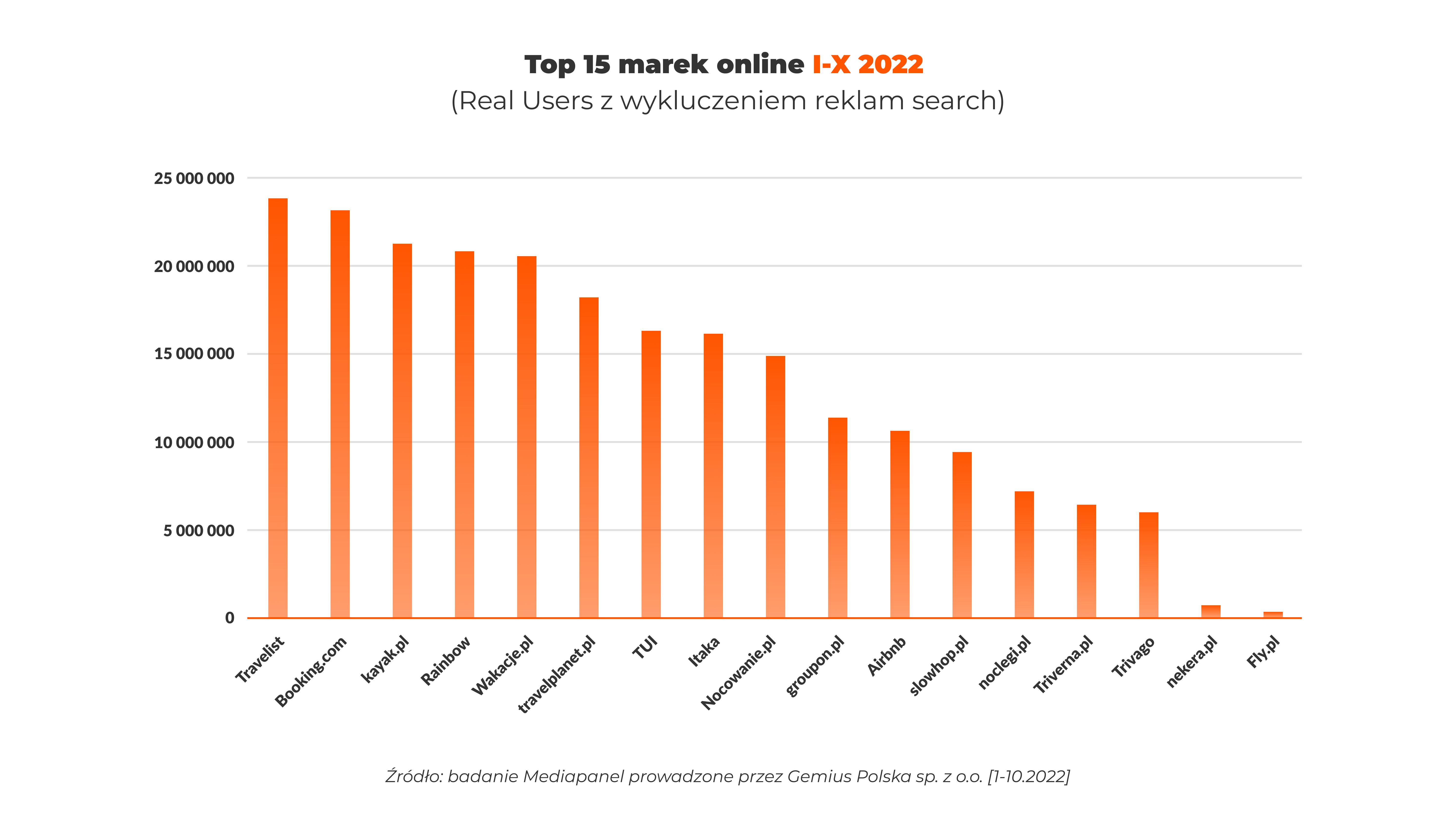 Travelist.pl znalazł się na pierwszym miejscu rankingu „TOP 15 brandów online” w kategorii travel – wynika z badania Mediapanel, przeprowadzonego przez Gemius Polska. Portal rezerwacyjny w okresie od stycznia do października 2022 r. dotarł do niemal 24 mln realnych użytkowników.