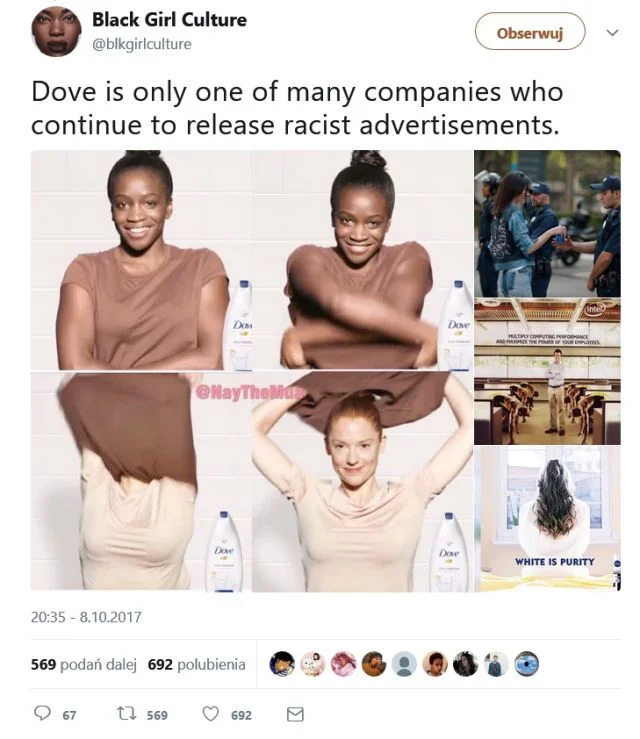 Nie jest jednak powiedziane, że każda próba stworzenia kampanii inkluzywnej musi zakończyć się sukcesem i że wystarczą dobre chęci, aby podbić serca odbiorców. Przykładem, w którym komunikacja marki wyrządziła większą krzywdę niż przysporzyła pożytku, jest jedna z kampanii Dove – marki rozpowszechniającej ideę piękna w każdej postaci. Niestety reklama z 2017 roku położyła cień na działaniach brandu – w jednym ze spotów Dove przedstawiono czarnoskórą kobietę zdejmującą koszulę, która w kolejnym ujęciu “zmienia się” w białą kobietę po użyciu balsamu do ciała. Marka Dove twierdzi, że chciała jedynie przedstawić dwie różne kobiety w ramach celebracji różnorodnego piękna, a rzekomo rasistowski efekt „przed i po” był czymś zupełnie niezamierzonym, co wyszło dopiero po interpretacji odbiorców. Marka przeprosiła za niedopatrzenie i usunęła reklamę po licznych nieprzychylnych reakcjach.